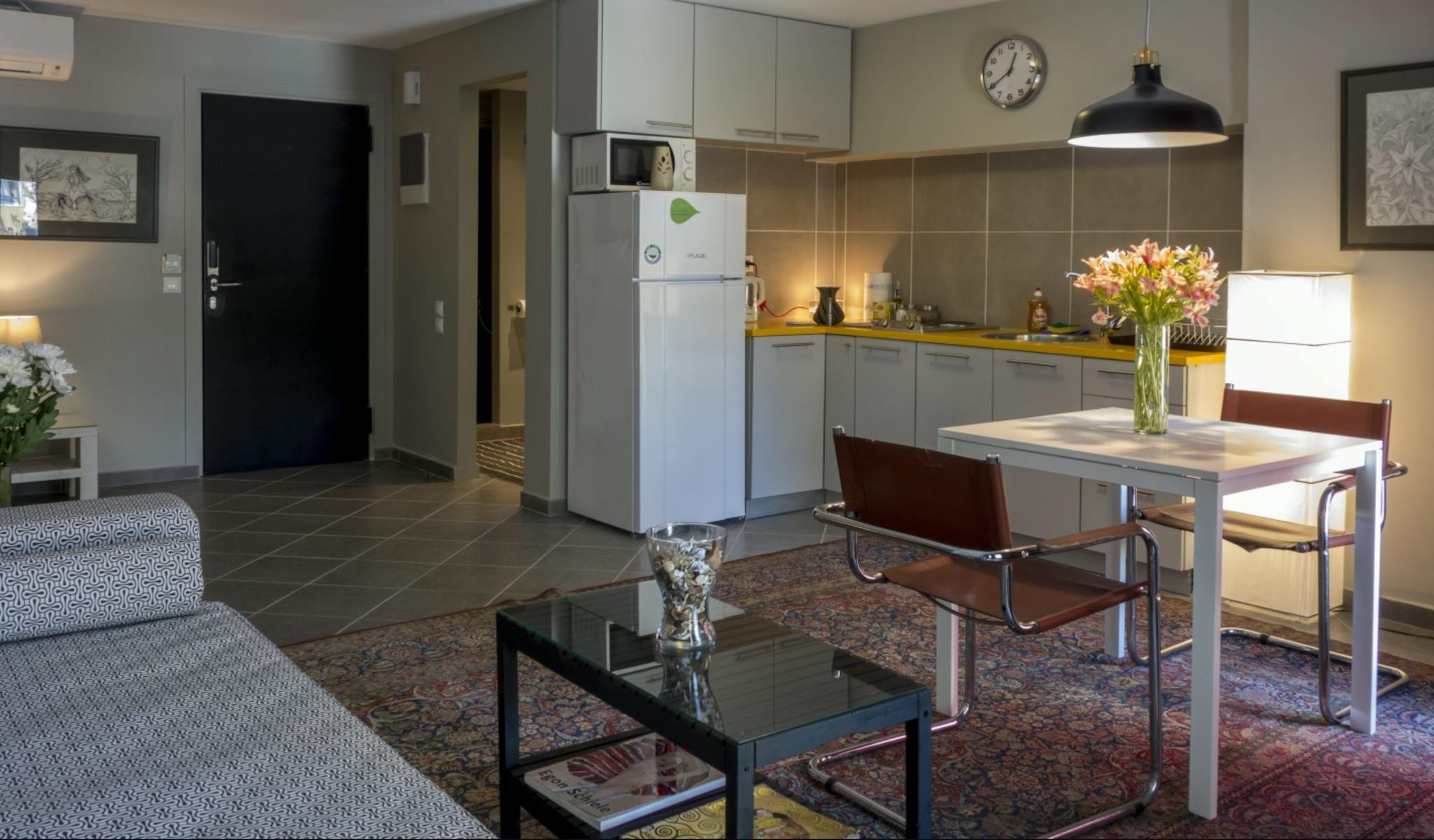 The apartment is brand new with large windows and a cozy balcony. King-size bed with a super comfortable mattress and a sofa that becomes a double bed. The kitchen is fully equipped and has an electric stove with pans and pots for cooking, a microwave with a grill function, a large refrigerator, a toaster, and a kettle as well as instant coffee, tea, and sugar for breakfast. The apartment is equipped with a keyless card system for opening both the main entrance door as well as the apartment itself. Α safe with a keypad for securing valuable items is available in the apartment. Very fast wireless internet.