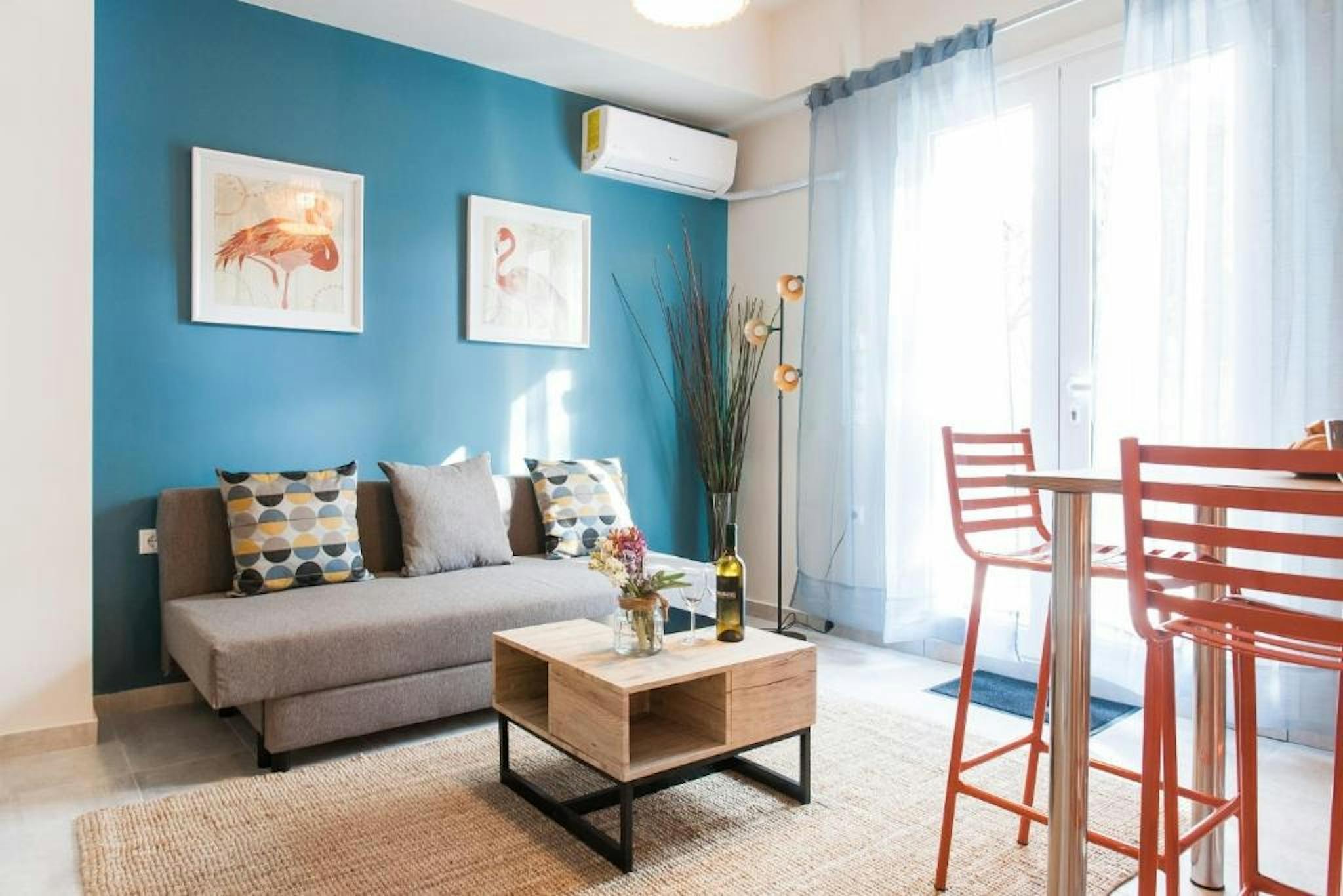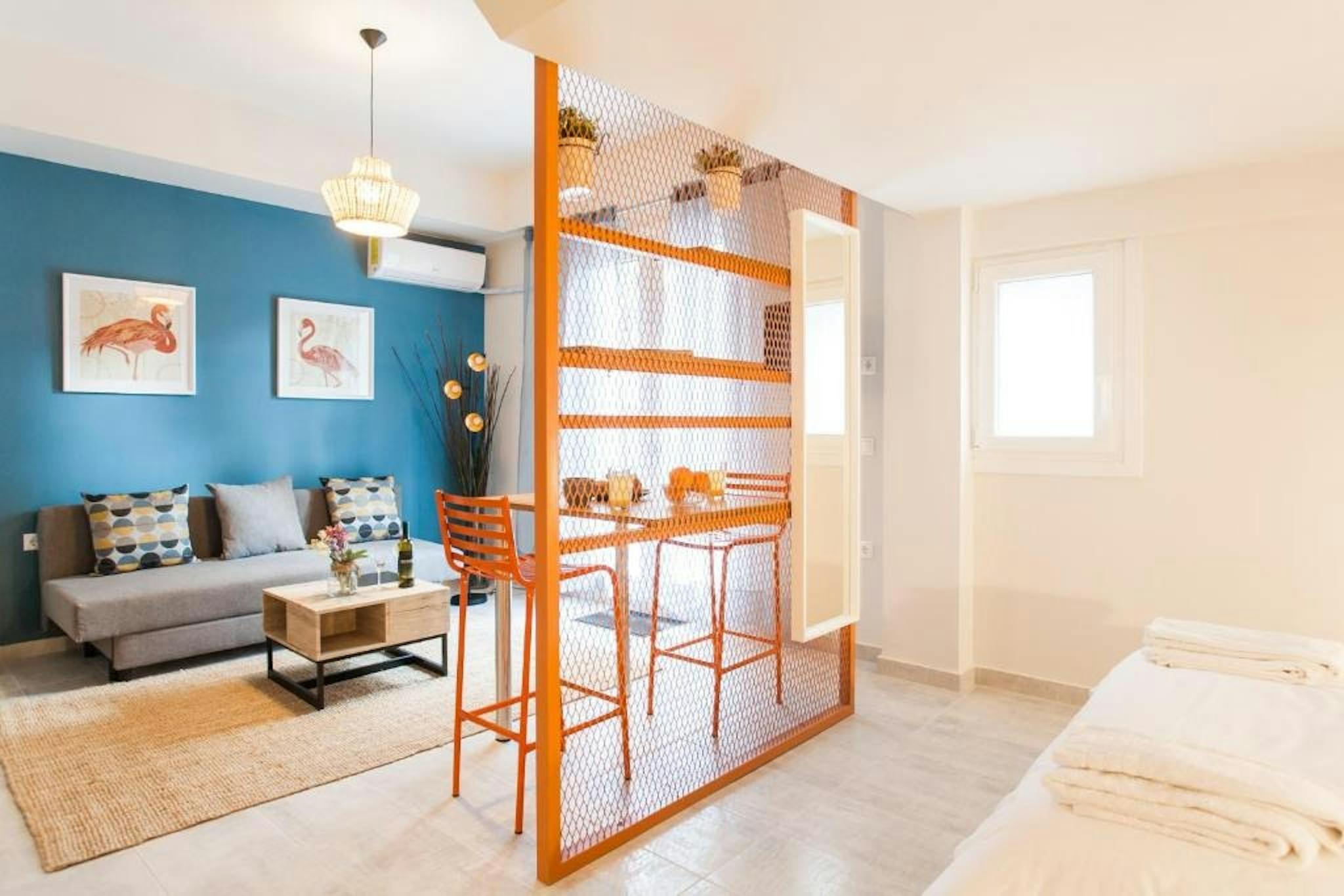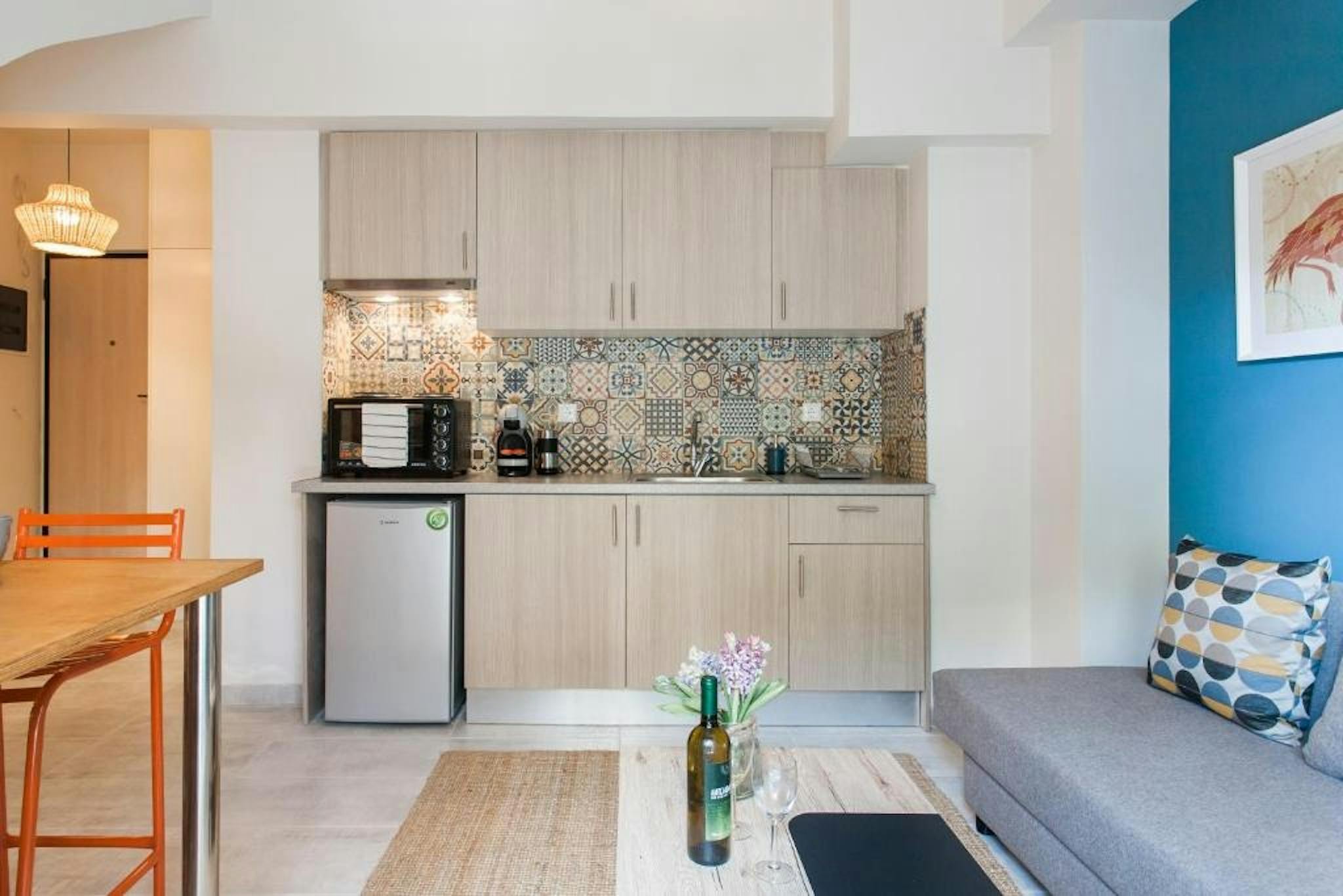 This fully renovated 35 sqm studio apartment is situated in the Ampelokipoi neighborhood, a very hip and youthful area! The apartment is located on the street level. This cozy home consists of an open space that includes a playful living room, and a fully equipped kitchen, with an elevated dining table that can also be used as the perfect workstation, a built-in bedroom, and a comfortable closet. The apartment has a private spacious bathroom too, freshly renovated, made of bright joyful forged cement for making your experience even more enjoyable.