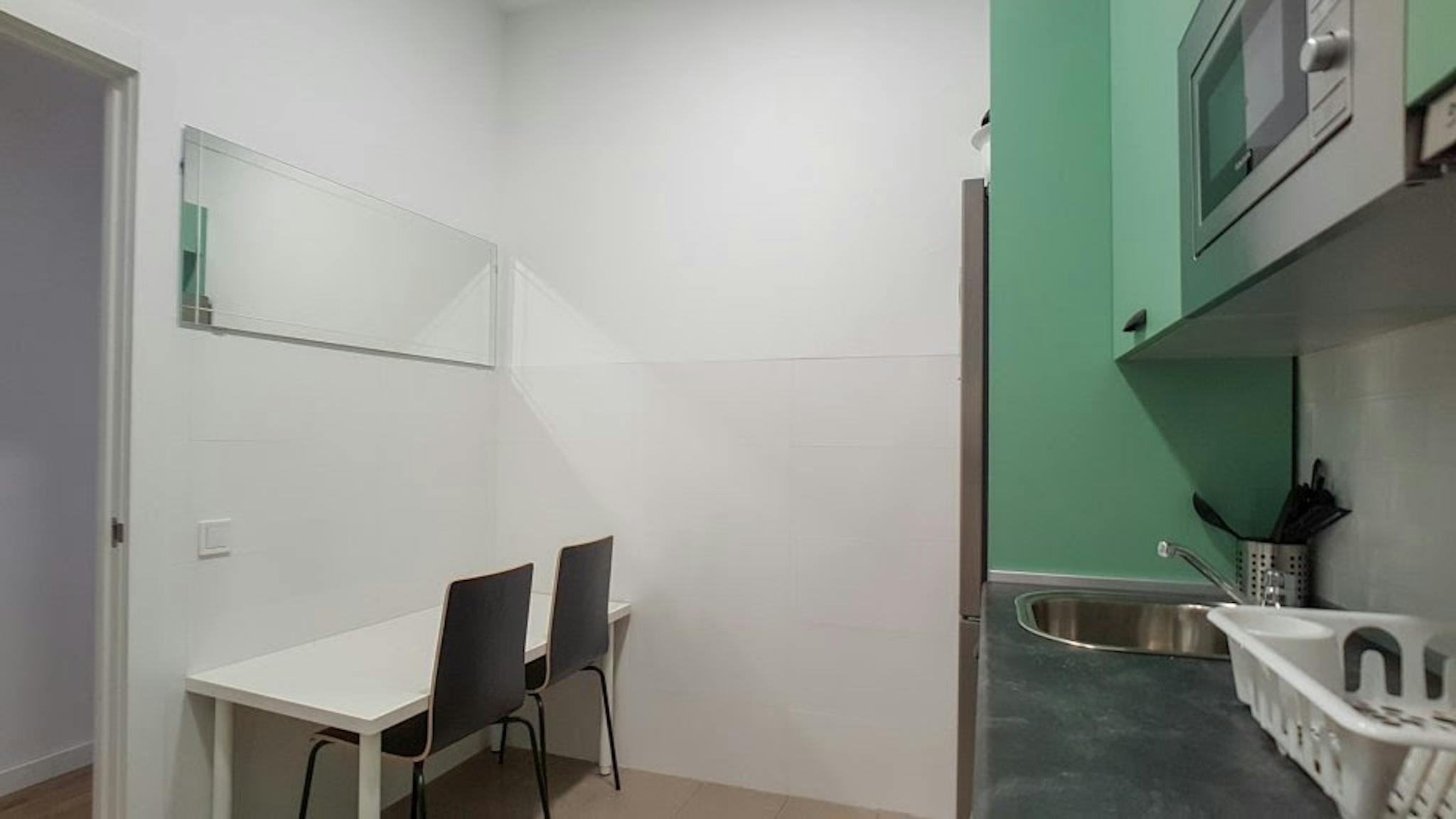 La habitación cuenta con cama matrimonio, zona de escritorio y armario. El apartamento cuenta con cocina completamente equipada y los dos baños serán compartidos por un máximo de 7 personas.
