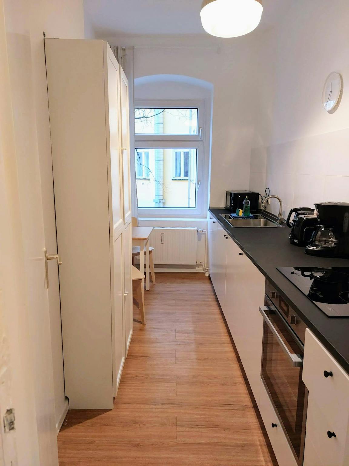 Our Studio is suitable for 2 people and consists of a kitchen, bathroom and combined living/bedroom. This apartment has been individually furnished and lovingly designed to make you feel completely at home. The kitchen is fully equipped with a dishwasher, stove and oven, dishes, pots, pans, etc. In the small bathroom there is a shower, toilet and a washing machine. Iron and ironing board, drying rack and pegs are of course available as well as towels and linen. Due to the location of our house in the second backyard this apartment is quiet. Included in the price is a bi-weekly cleaning.