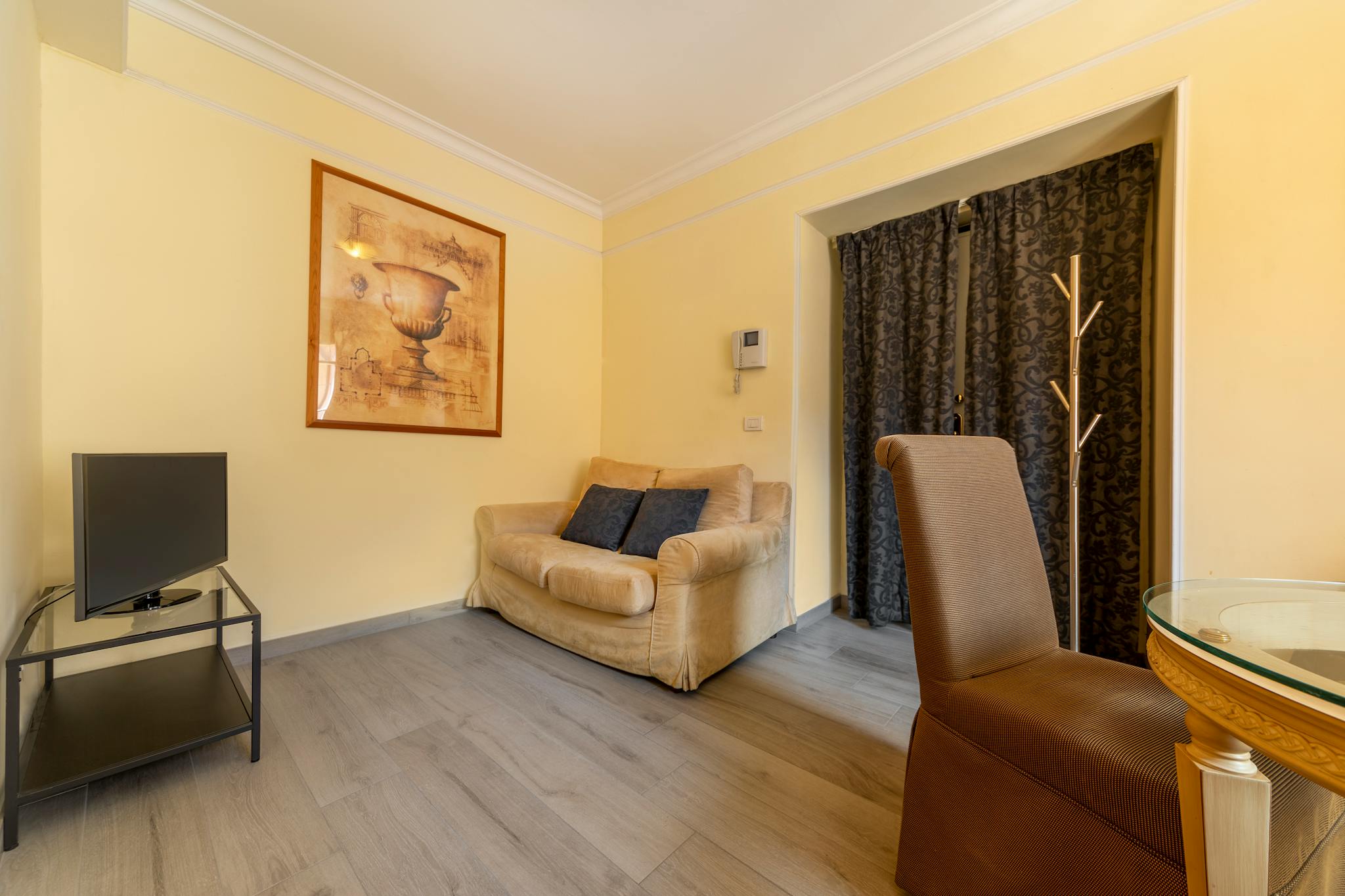 The apartment opens up directly onto a charming living room with a sofa bed (140 x 190 cm), a 32” TV, a crystal table with two comfortable armchairs. The separate kitchen, separated from both the living room and the bedroom by wooden and glass doors, is fully equipped and complete with a leather console, an electric oven, a dishwasher and induction plates.