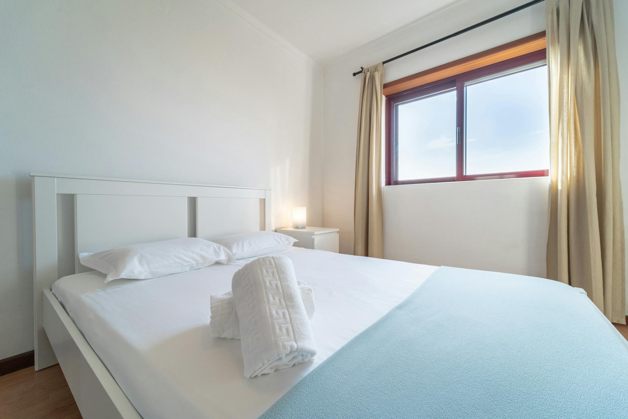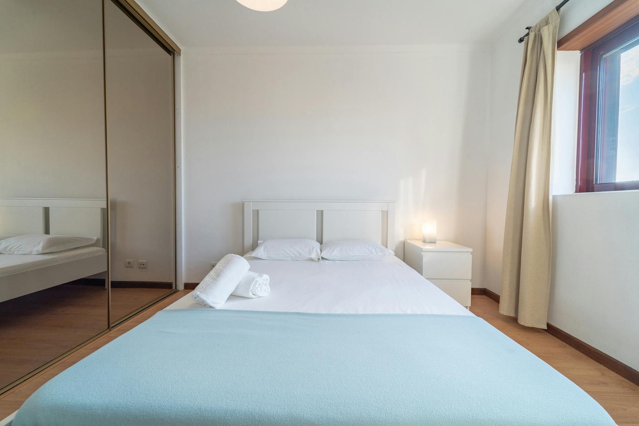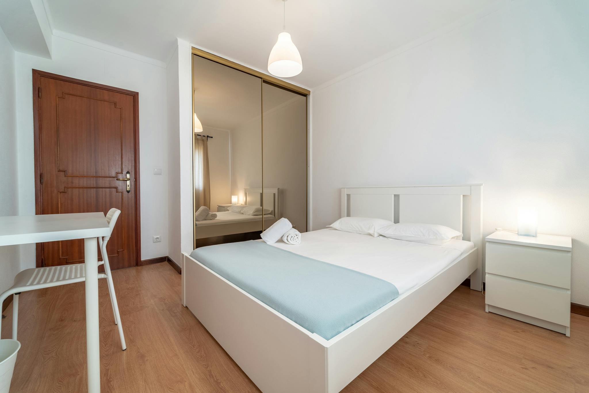 Este quarto dispõe de cama de casal, secretária, candeeiro e roupeiro.