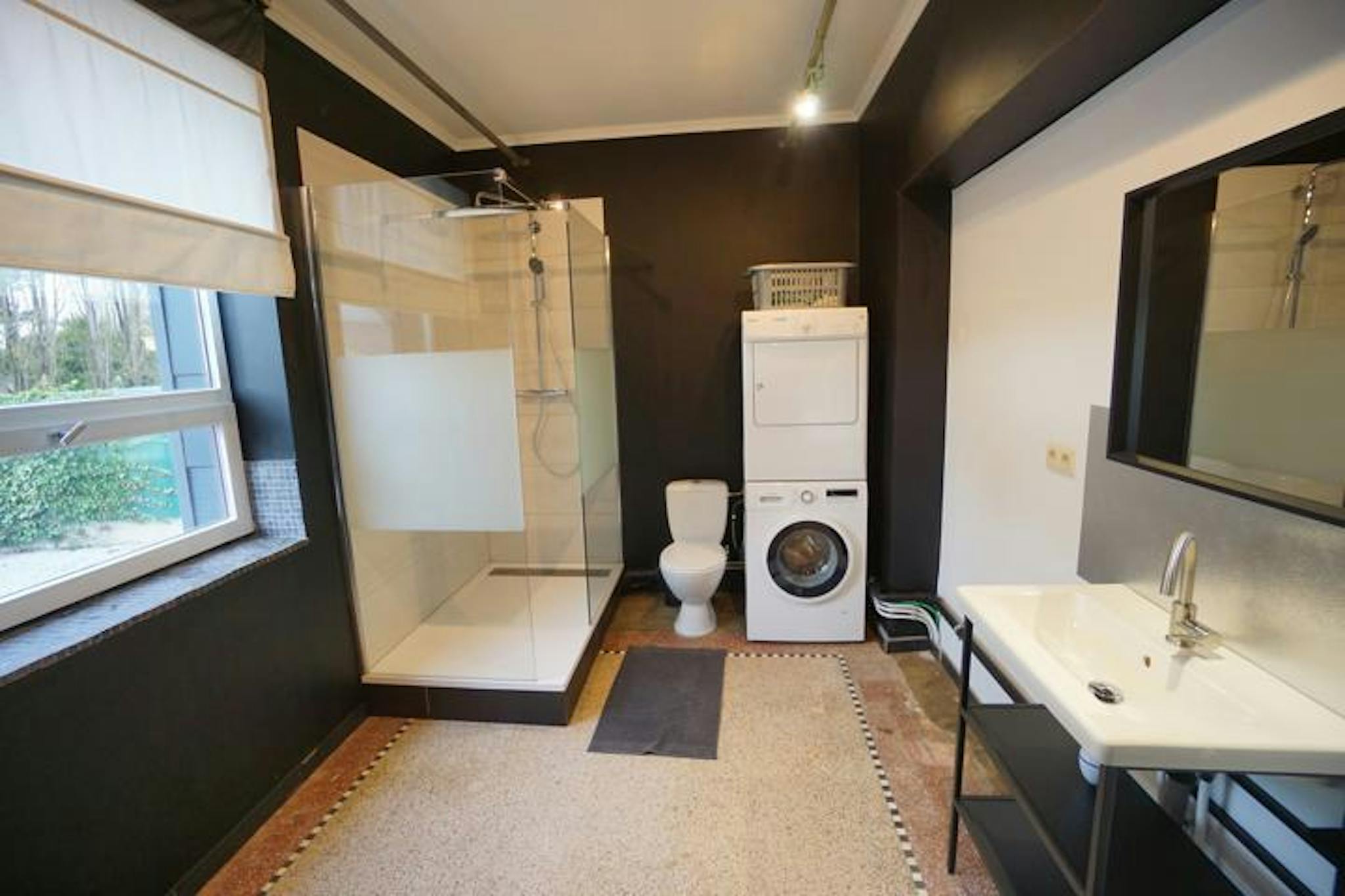 -Au 1er: une salle de douches (WC, douche, double lavabo), une cuisine full équipée (électros et ustensiles), deux chambres de 16m2.