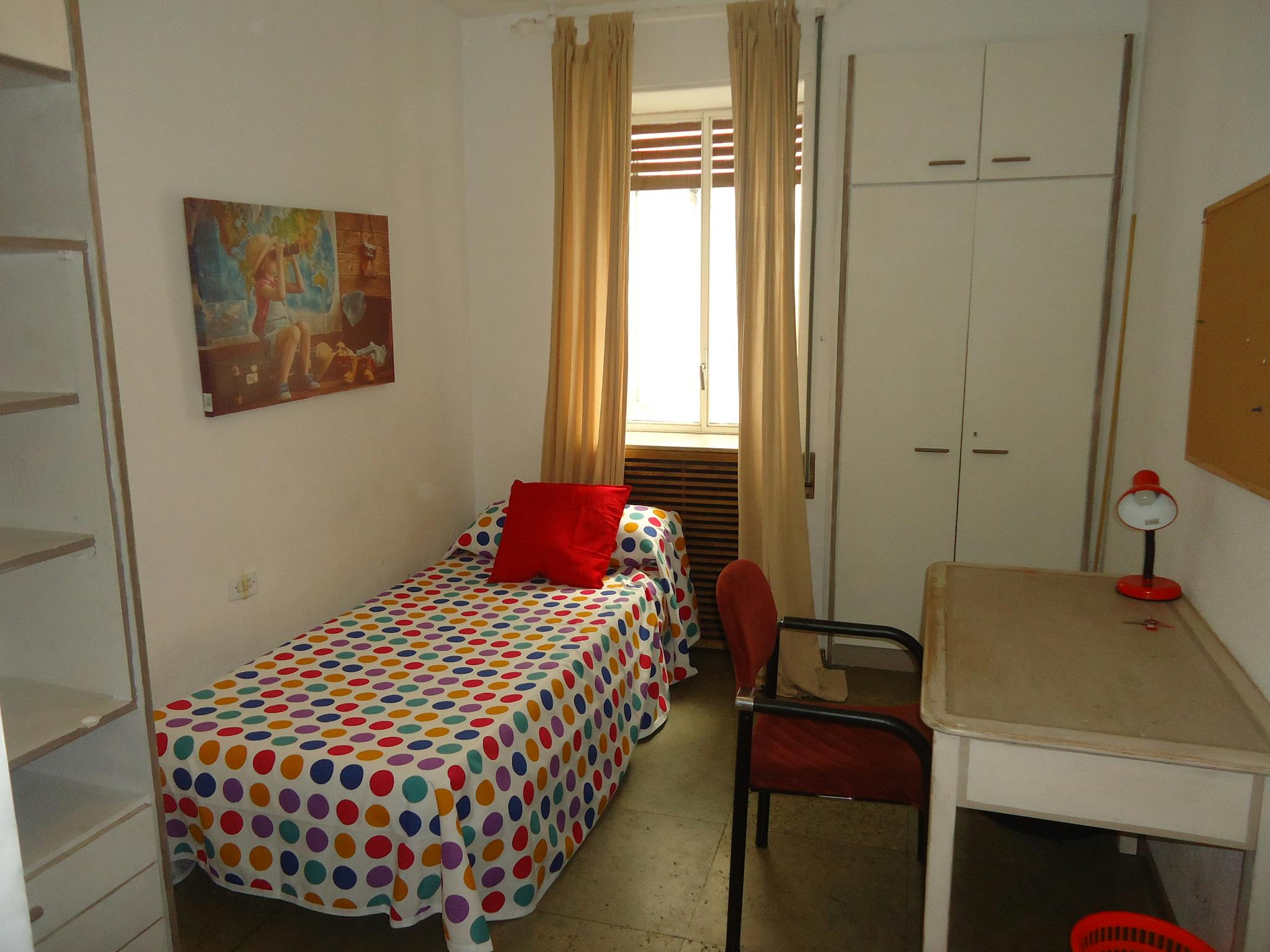 Individual interior room, very quiet, perfect for studying. Completely furnished: single size bed, built-in wardrobe, desk, chair, desk lamp and a piece of furniture with a lot of storage capacity. Space heater. The community and water and expenses are included in the price. The wifi, electricity and internet registry and installation expenses are paid as an extra and divided among all the tenants. The flat is all electric.