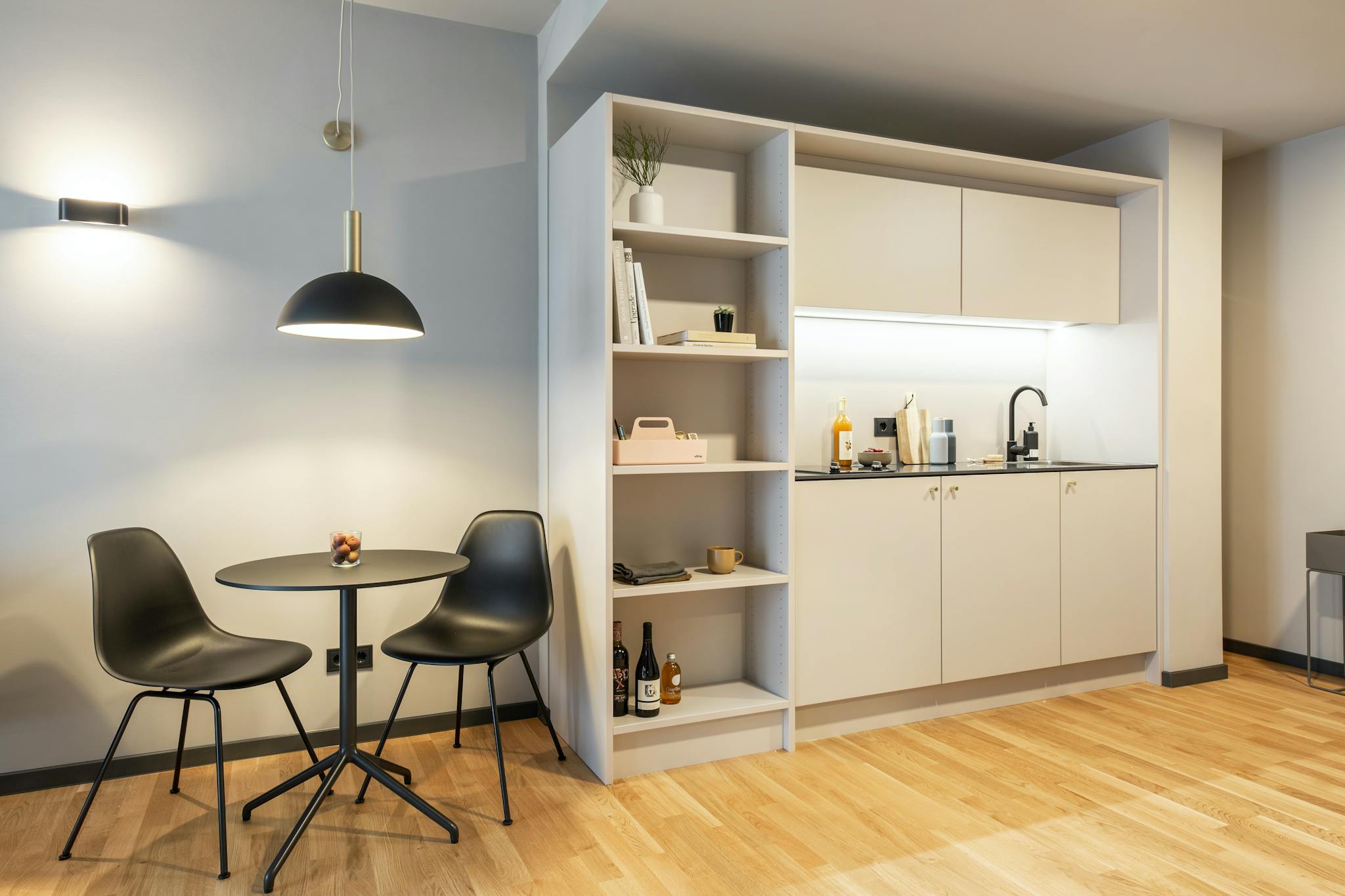 The medium apartment is divided into living, working, cooking and dining areas. You sleep in a comfortable 160-cm double bed. A swiveling smart TV and a sound box provide good entertainment. Partial apartments Medium are equipped with a washer-dryer and 2-room apartments - in this category - are also available. If you value these features, please inform our reservation team.