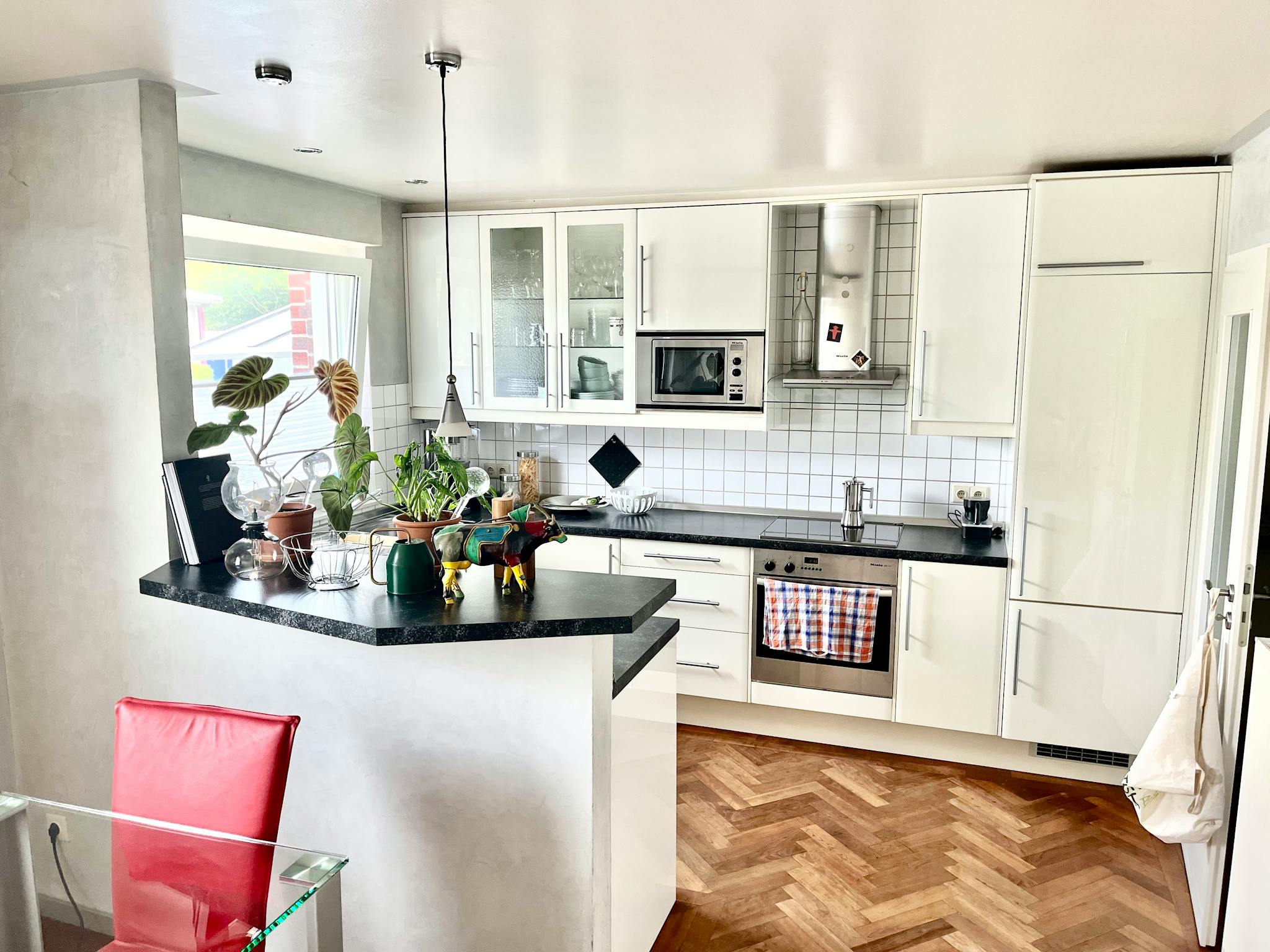 Hochparterre, Echtholzparkett, Geräumige Einbauküche mit Miele Elektrogeräten, großes Wohnzimmer, großes Schlafzimmer mit 2x2,20m Bett, TV, WLAN, Süd-Terasse mit Grill