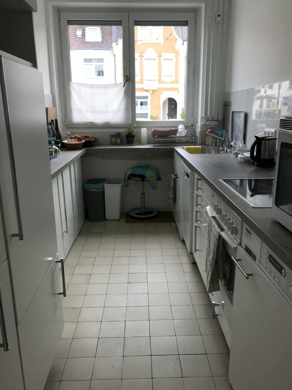 Helles, neu + freundlich möbliertes Zimmer mit großer Fensterfront, ca. 19qm, in 3-Zi.-WG-Wohnung (76 qm) zur ruhigen + sonnigen Gartenseite im Hochparterre/1.OG. Sanierter Altbau von 1929 (Bauhausstil)eines 8-Parteien-Hauses.