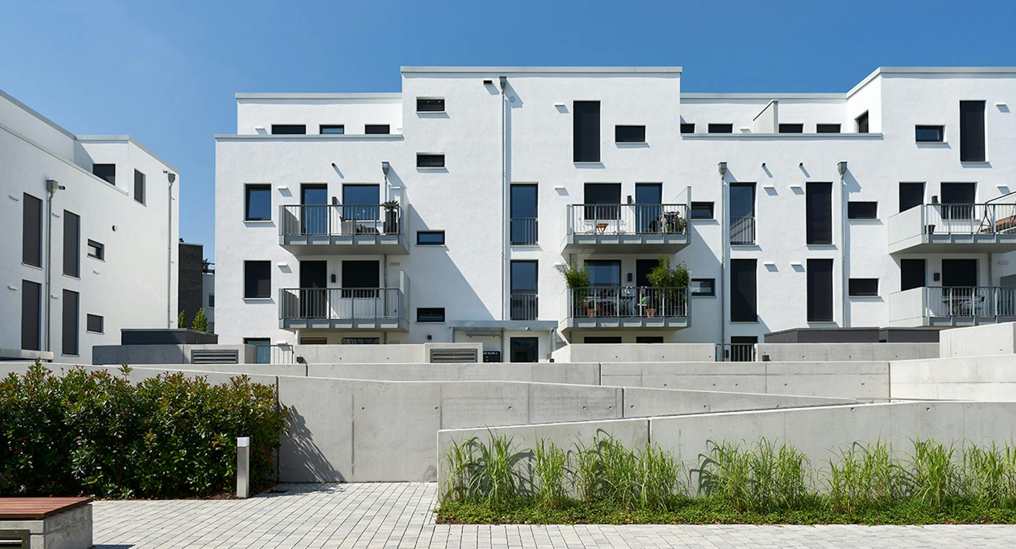 Die Wohnanlage besticht durch seine moderne, aufgelockerte Architektur. Sie wurde von renommierten Architekten der Schweizer Ideen-Schmiede Atelier 5 entworfen. Neben einer eleganten Bauhaus-Architektur mit starken Bezügen zu Corbusier steht die Vernetzung im Zeitalter 4.0 im Zentrum des Konzeptes. Hierzu gehört die Steuerung der Heizung, Licht und Textilscreens über das (hidden) von Busch-Jaeger.