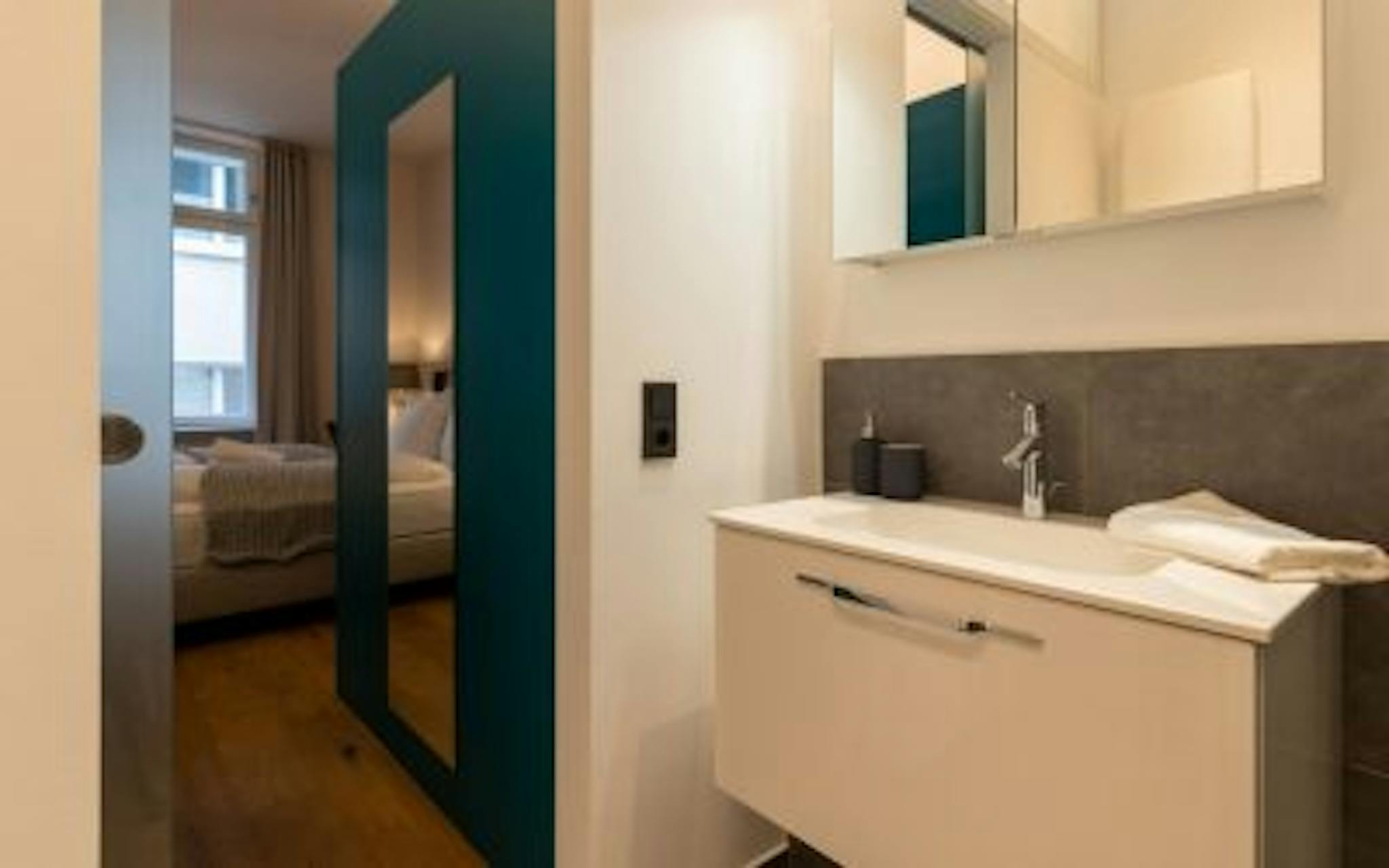 The listed old building from 1885 was completely renovated in 2017 and reveals a new shine without losing its old charm. Brand new technology and design meet the historical core of this beautiful old building. The rooms impress with their exclusive furnishings with designer furniture and heavenly discounts for box-spring beds. It became an oasis of well being for our personal worthy guests. In the only 9 exclusive apartments, extravagant color combinations and iconic black and white pictures dominate, the petrol blue kitchen which is one of the eye catchers of the apartment.