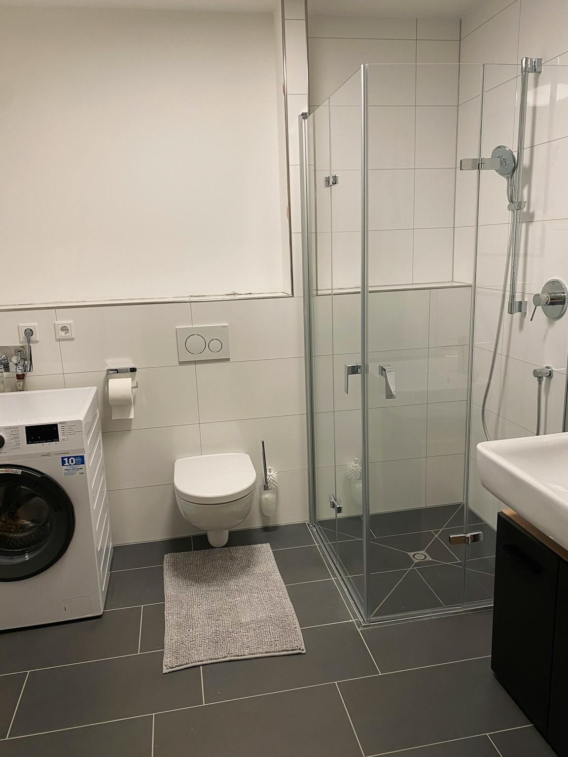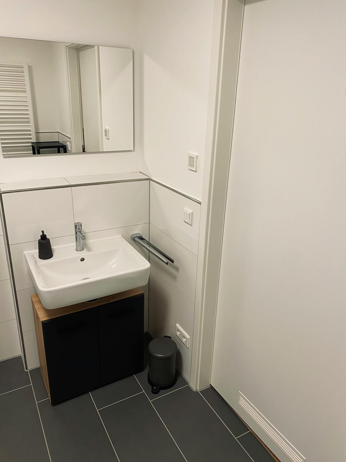 The modern bathroom is tiled with floor-level shower white / anthracite. In the bathroom you will find a vanity unit, a bathroom shelf and a mirror.