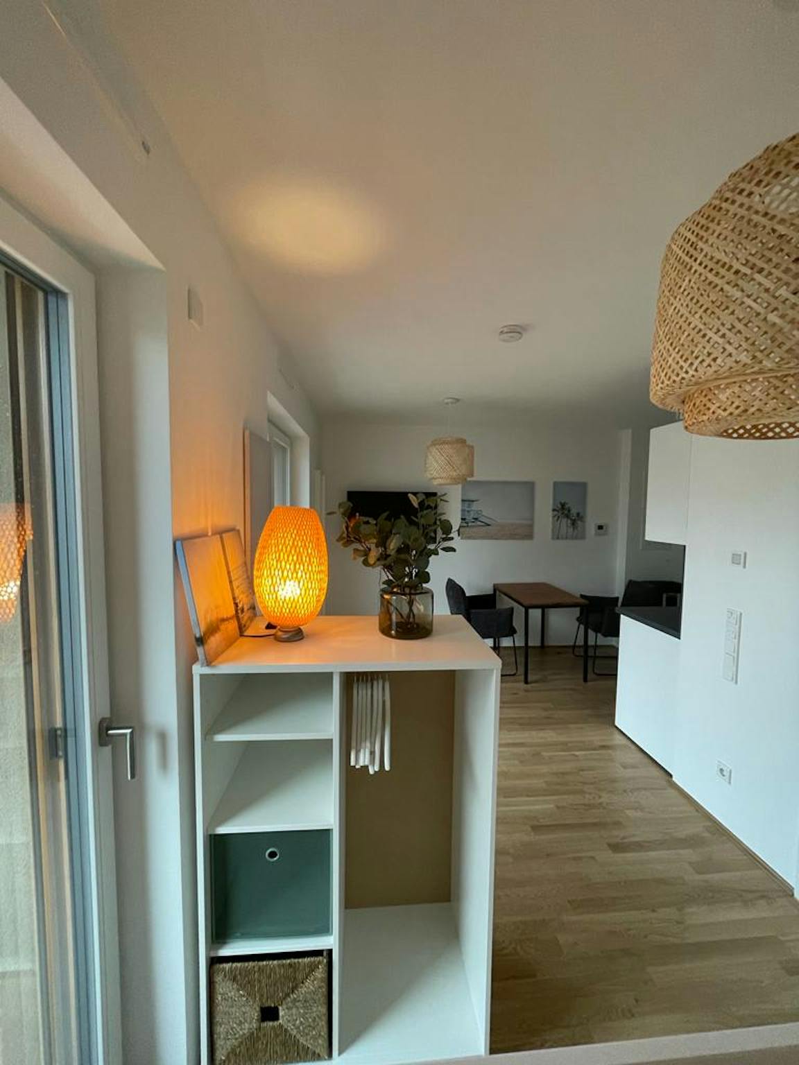 Furthermore, the apartment is fully furnished with a mirror, a closet, a chest of drawers, a bed with storage space, a dining and working table with designer chairs, as well as a 43-inch TV with swivel wall mount.