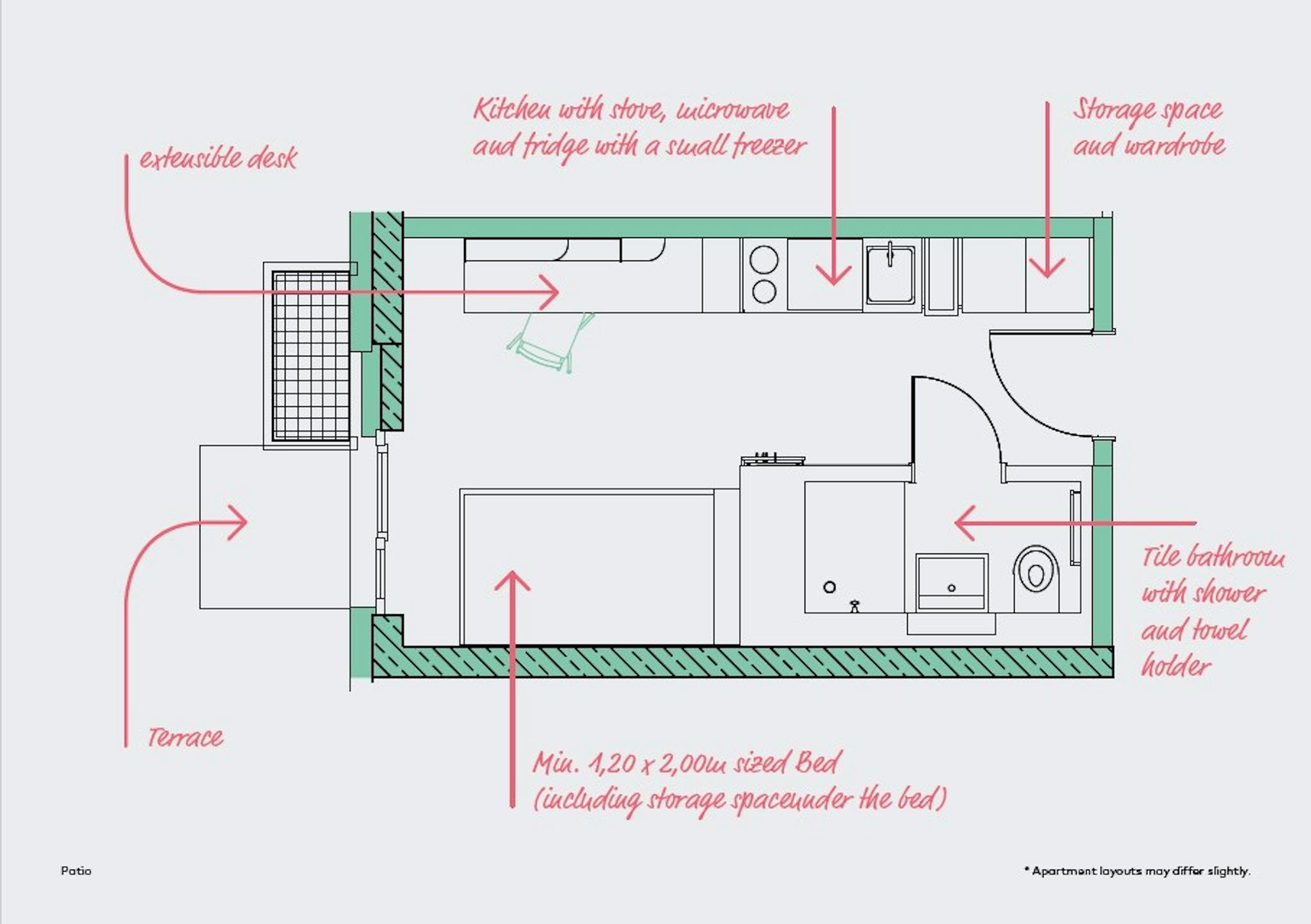 "Klein" aber "Oho". In unserem 16m2 großen Patio Apartment genießt du die Vorteile eines Apartments mit eigener Terrasse. Zusätzlich hast du den direkten und schnellsten Zugang zum Innenhof und unseren Community Areas.