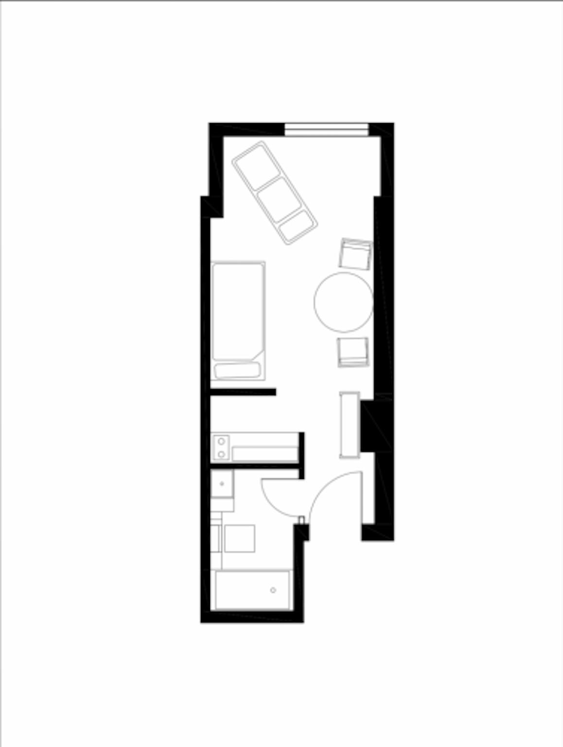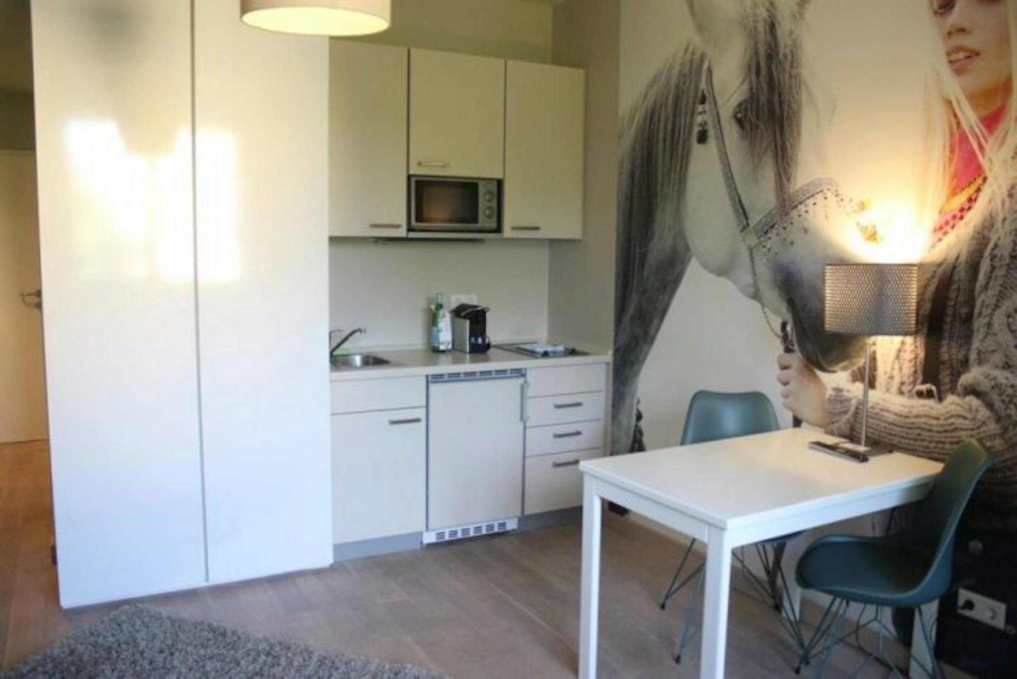 One-room apartment from 28 - 36 m2, with single bed (1.00 x 2.00 meters) or double bed (1.40 x 2.00 meters), fully equipped kitchenette (microwave, ceramic hob, refrigerator, Nespresso coffee machine, pots, pans, glasses, plates, etc.), exclusive bathroom with bathtub, towels and bed linen, dining area and TV. The apartment is located on floor 1 - 5. The size of the apartment as well as the bed size and style varies depending on the apartment and is allocated according to availability.