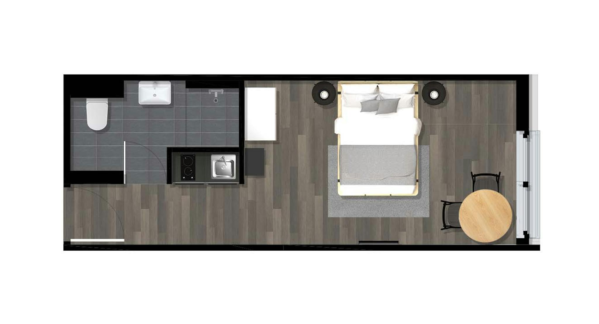 Our private apartments come fully furnished with everything you need for a comfortable daily life, such as a bed with a premium mattress with bedsheets, pillows, and duvets, a large wardrobe, table, and chair for work with a lamp. Each flat has a spacious bathroom, and a fully equipped modern kitchenette with everything from pans to a coffee machine, kettle and toaster.