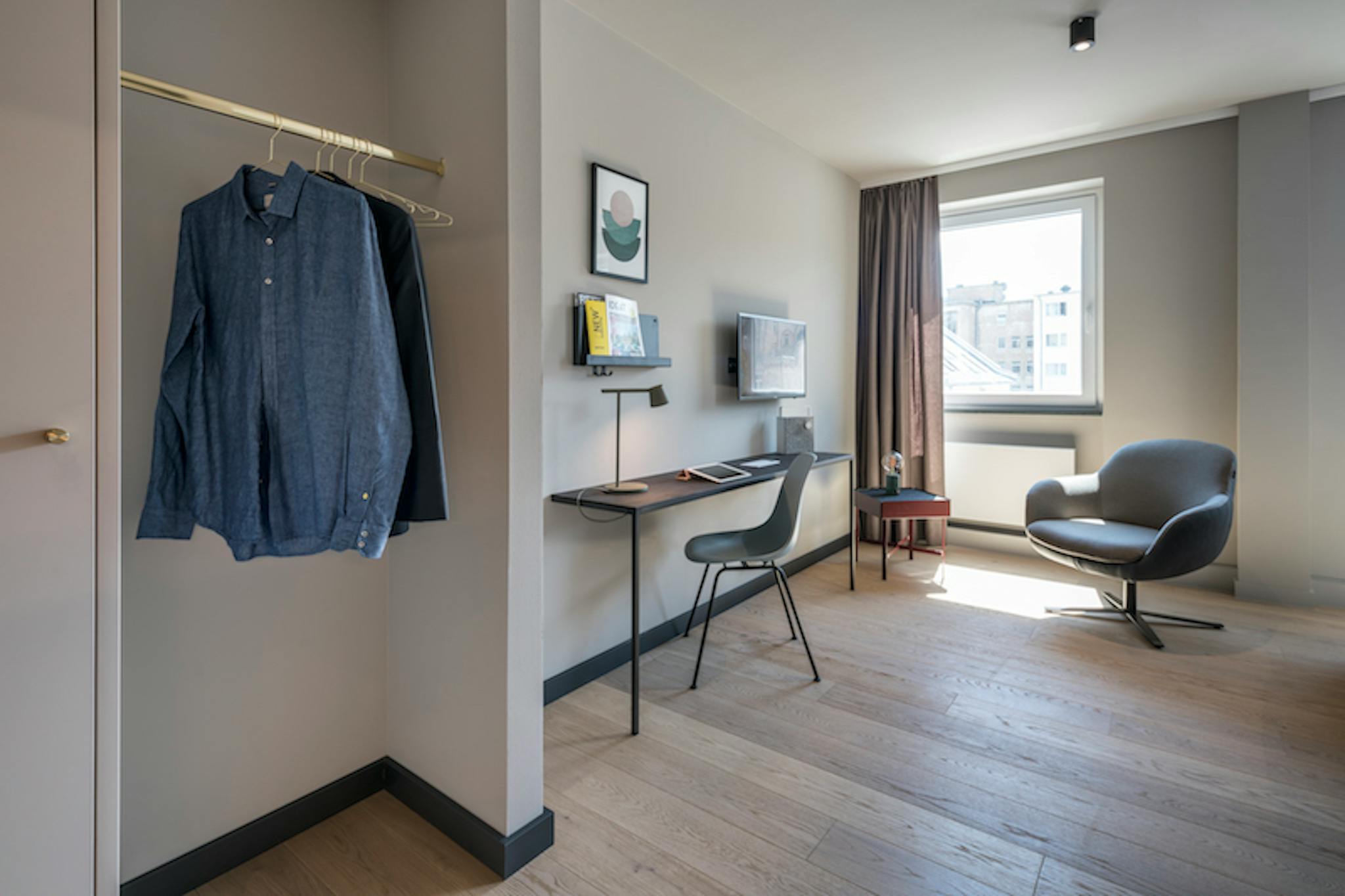 Das Bett bietet mit 1,60m Breite bequem Platz; auch für zwei Personen. Im Sessel lässt es sich abends zu Musik, Fernsehen oder einem guten Buch entspannen. Alle Apartments sind mit hochwertigen Eichenparkett ausgestattet. Es ist besonders geeignet für Personen, die für längere Zeit in Frankfurt arbeiten und den Hauptbahnhof und das Bankenviertel fußläufig erreichen möchten.