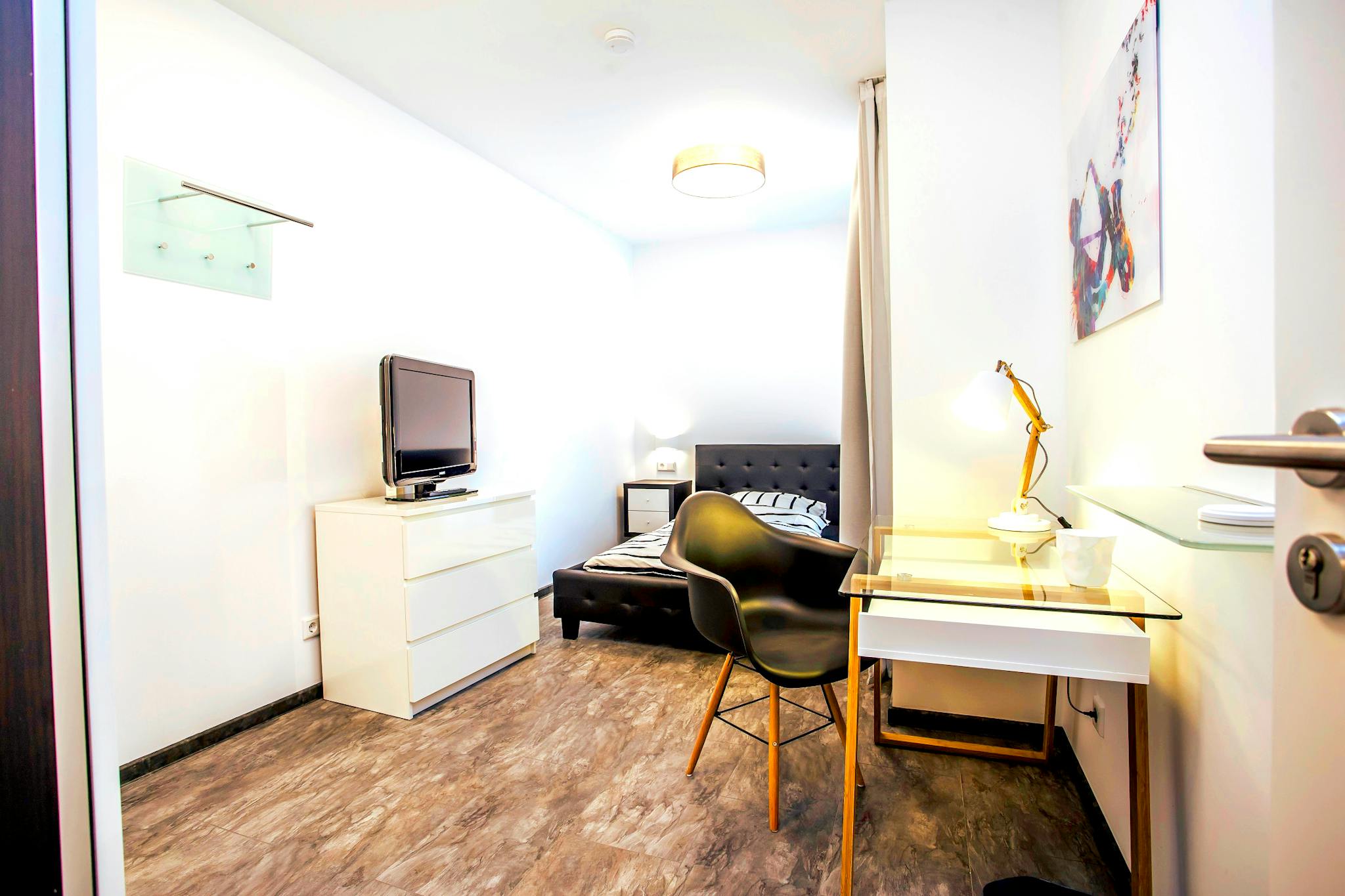 Jedes der Zimmer ist komlett möbliert und verfügt über ein Bett inkl. Bettzeug und Bettwäsche, Kleiderschrank, Schreibtisch mit Stuhl, eigener WLAN Router und Fernseher.