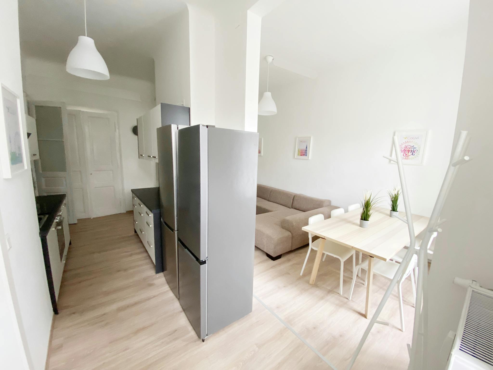 In your room (NUMBER 5 IN THE FLOOR PLAN) you will find a comfortable double bed, a chill area with a couch, fresh linen, wardrobe and a workspace). In the apartment you have everything you need (washing-machine, hair drier....) and more. Everything (heating, electricity, internet etc.) is included in the price (All-In), so you can move in directly without worrying about anything. The huge flat has a big living area, a very nice living-kitchen, 2 bathrooms a balcony.