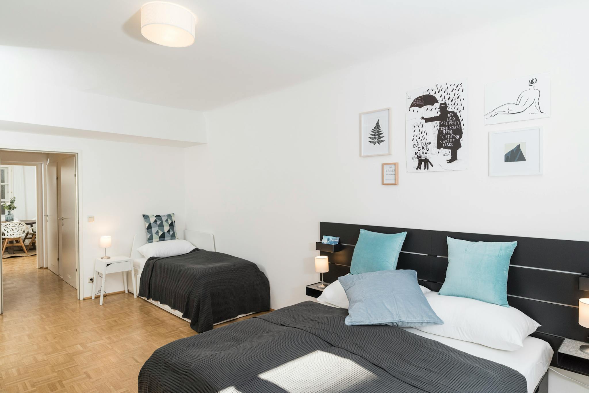 In the immediate vicinity of spectacular Kunsthaus Graz this lovely one bedroom apartment decorated with care and eye for detail, awaits you to come and explore the city of Graz! The 70m2 apartment offers accommodation for up to 6 people in one cozy bedroom with one double and one single bed as well as one convertible sofa and one single bed in the living room. The bathroom equipped with a bathtub offers you relaxation after a busy day. The fully equipped kitchen gives you possibility to prepare your own home-cooked meals, to be enjoyed at the large round dining table! The apartment is equipped with necessary amenities to bring you the homey feel and make your stay pleasant. Wireless network is available and provided free of charge through out the apartment.