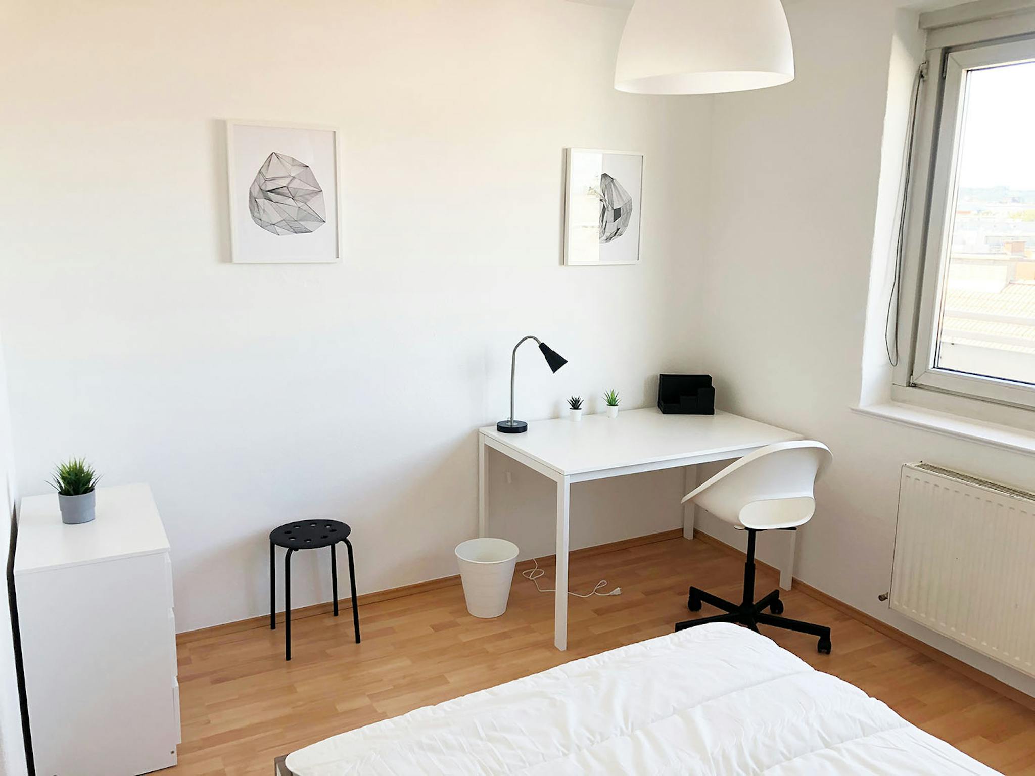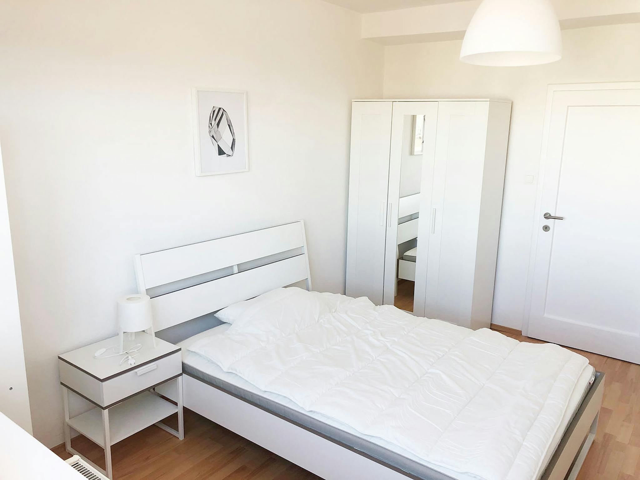 A bed with fresh linen, wardrobe and a workspace (Desk and chair).