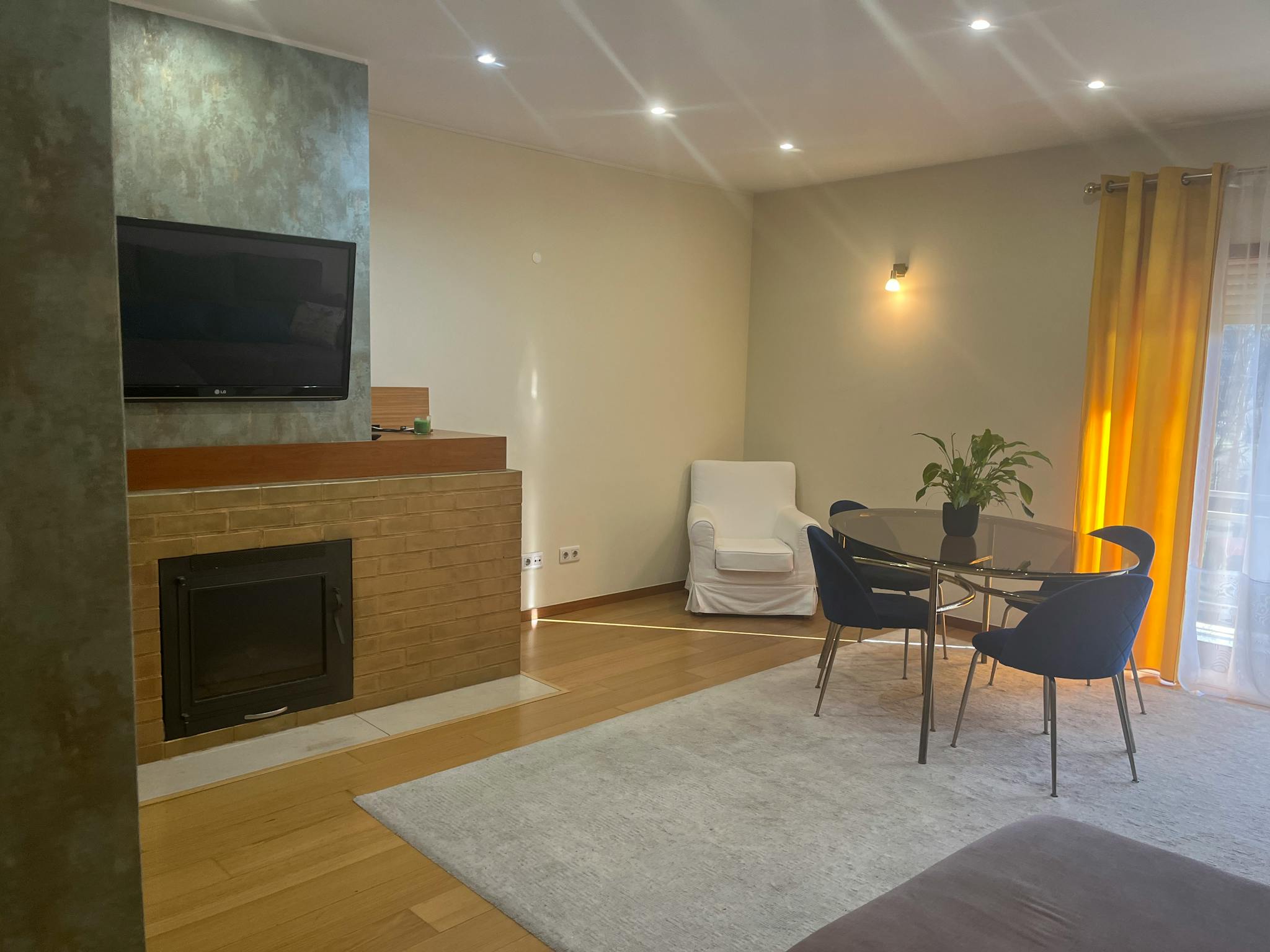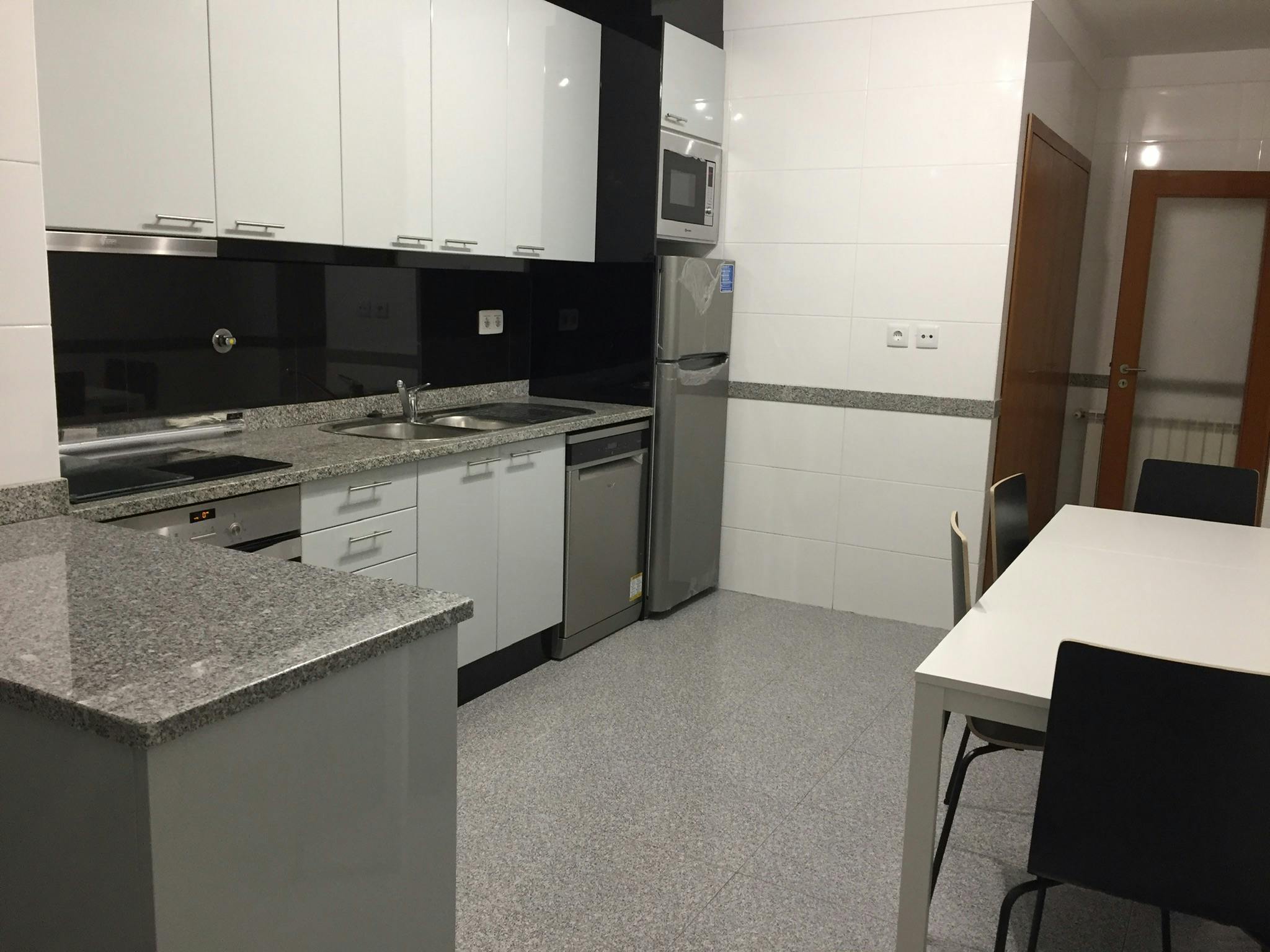 Amplo apartamento, para até 4 pessoas, com ótimo Hall de entrada, 3 varandas, cozinha totalmente equipado, sala com lareira, 2 quartos de casal com roupeiros embutidos, 2 casas de banho: a da suite com base de chuveiro e a outra com banheira de hidromassagem.