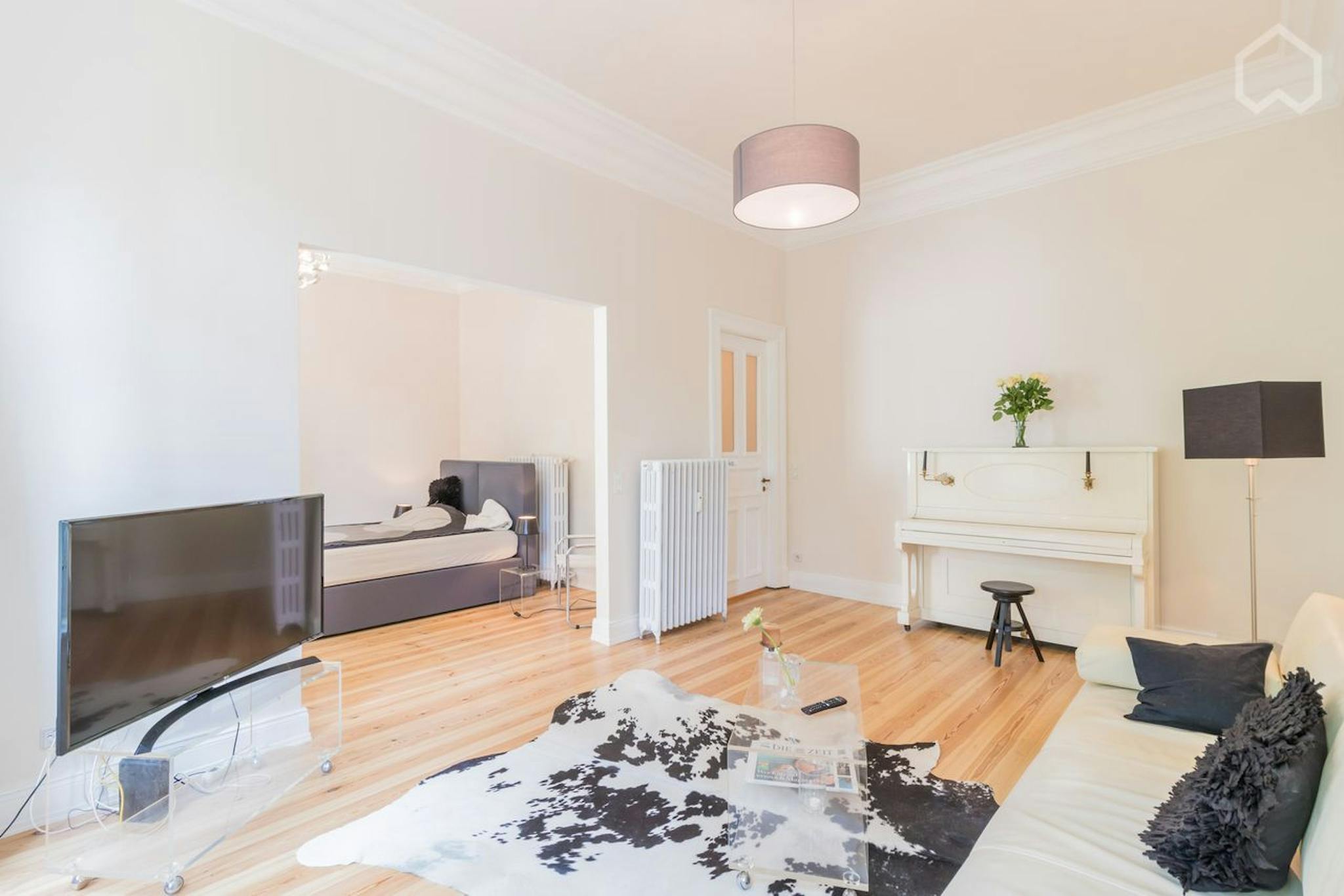This 70 sqm old apartment with classic elements has character and is very quiet. The two large rooms are intertwined, are not separated by a door and go out to the garden. The modern box spring bed has a width of 160 cm and you can comfortably sleep on it for two. The approximately 8 square meters large balcony invites you to linger in the afternoon and evening sun. The plank floor (Nordic pine) is about 130 years old, freshly sanded and sealed, stucco decoration, kitchen and bathroom are typical old style, but meet the upper standard of the apartment. The dressing room has about 5 square meters and is equipped with cupboards and shelves. Kitchen equipment: Refrigerator, Oven, Miele washer-dryer, Toaster, Freezer, Microwave, French Press Coffeemaker, baking Kettle, Crockery, Cutlery, Glasses, Pots, baking pans available, no dishwasher.