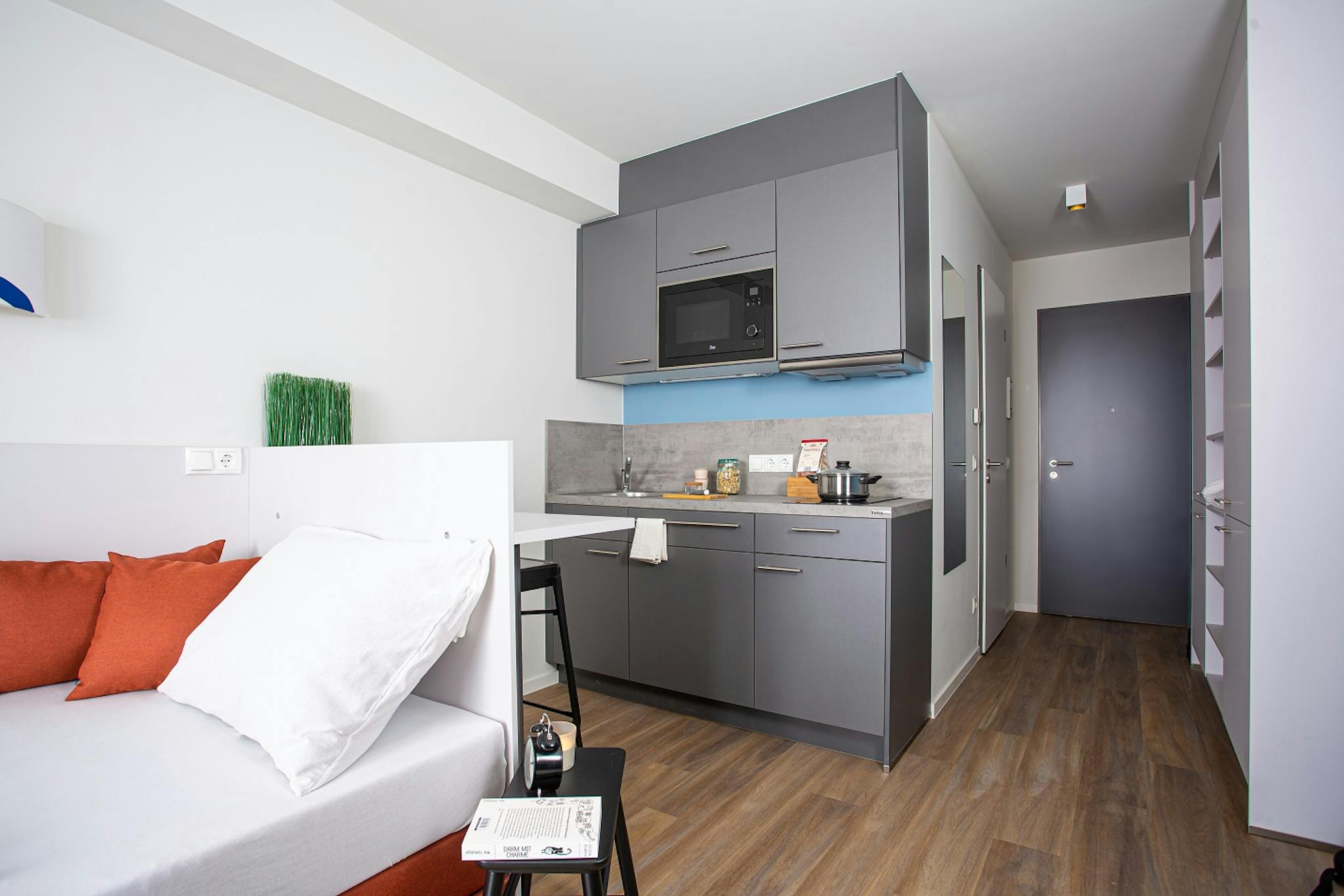 Your apartment offers a living room with a bed including a mattress, a desk with a chair, a cloakroom with a mirror, light-proof curtains, an intercom and, in general, extra storage space. The galley kitchen is equipped with two ceramic hobs, a combination microwave, fridge with freezer, a sink and counter. The modern tiled shower room has a toilet, a vanity with a mirror and additional storage space.