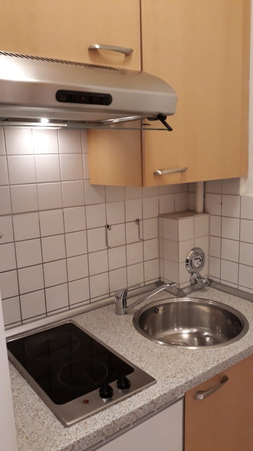 Im Wohnraum befindet sich ein Laminatboden sowie Fliesen in Küche und Bad.