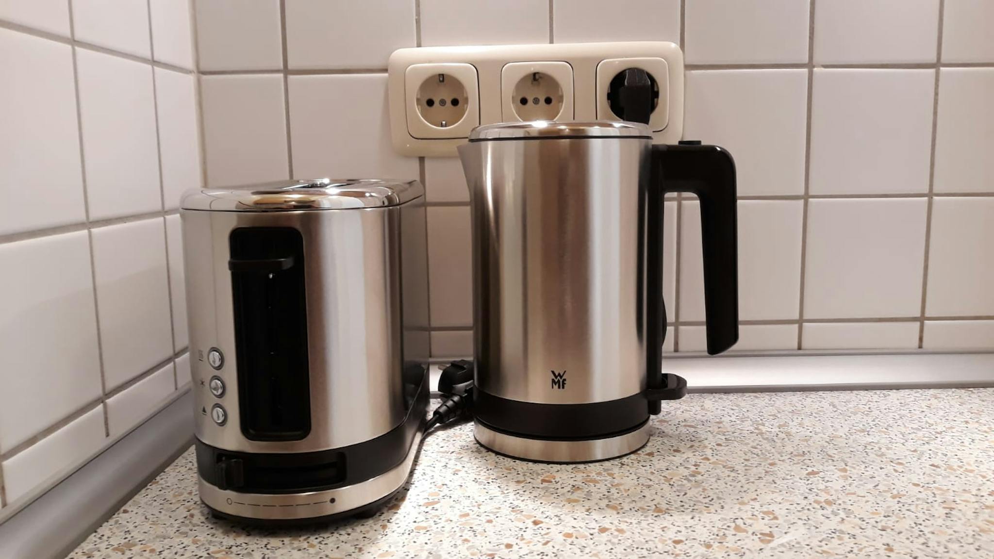 Voll ausgestattete Einbauküche mit Geschirr, Besteck, Töpfen, etc. sowie Kaffeeautomat Wasserkocher, Toaster.
