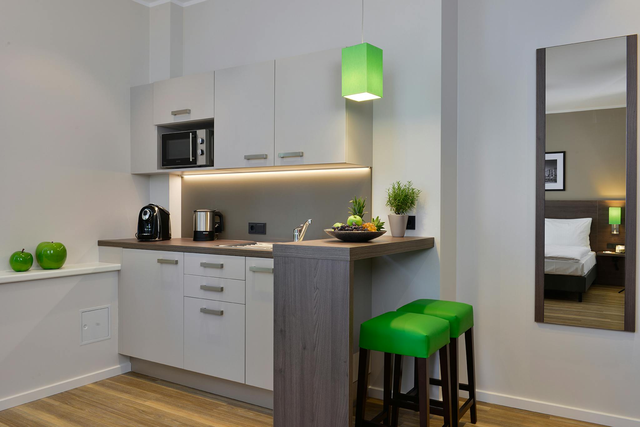 Our Premium Studio is part of a modern apartment hotel in the Northern part of Hamburg. Close to the hotel is a bus stop to reach the airport (3km) or city center (7km) with ease.