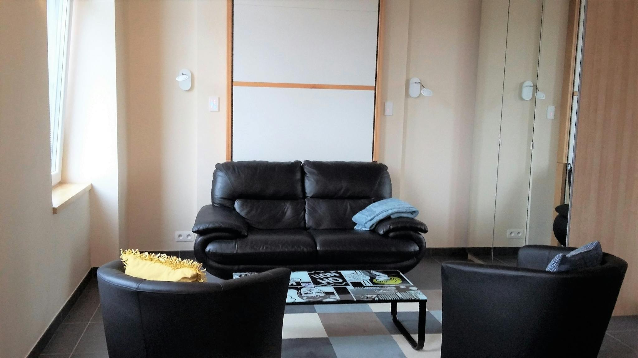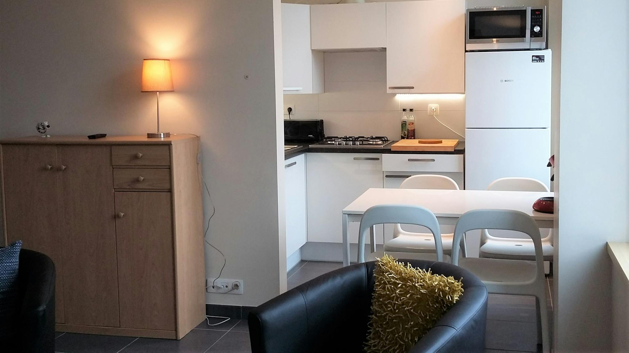 Fully furnished studio in a small building with only students and trainees living in. The bed is integrated in the ceiling so you just have to pull it down to sleep and while not sleeping you can enjoy a real living room! Great concept!