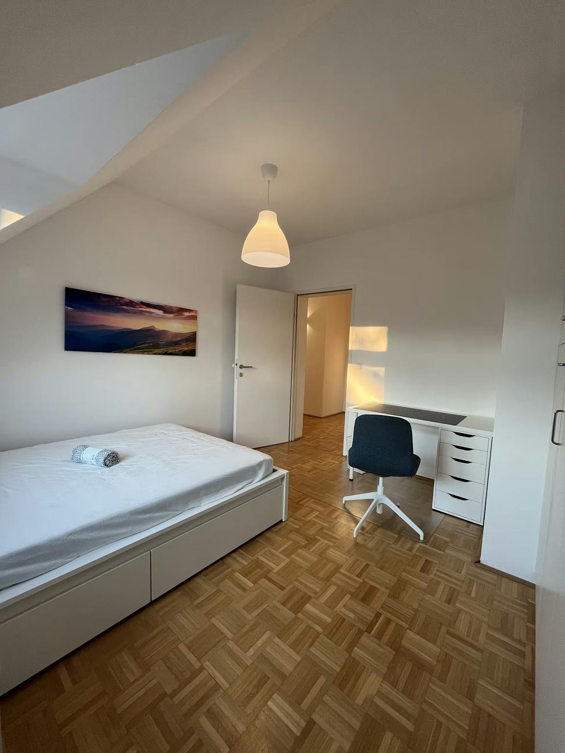 Das ca. 12m2 große Einzelzimmer bietet einen wunderschönen Blick auf den Pöstlingberg. Es ist sowohl voll möbliert für den sofortigen Einzug. Das abschließbare Privatzimmer ist mit einem Schreibtisch inkl. Rollsessel und 140/200 großen Bett mit einer bequemen Taschenfederkern-Matratze und Stauraum ausgestattet. Somit bietet das Zimmer den perfekten Raum für Schlaf und Studium bzw. Home-office.