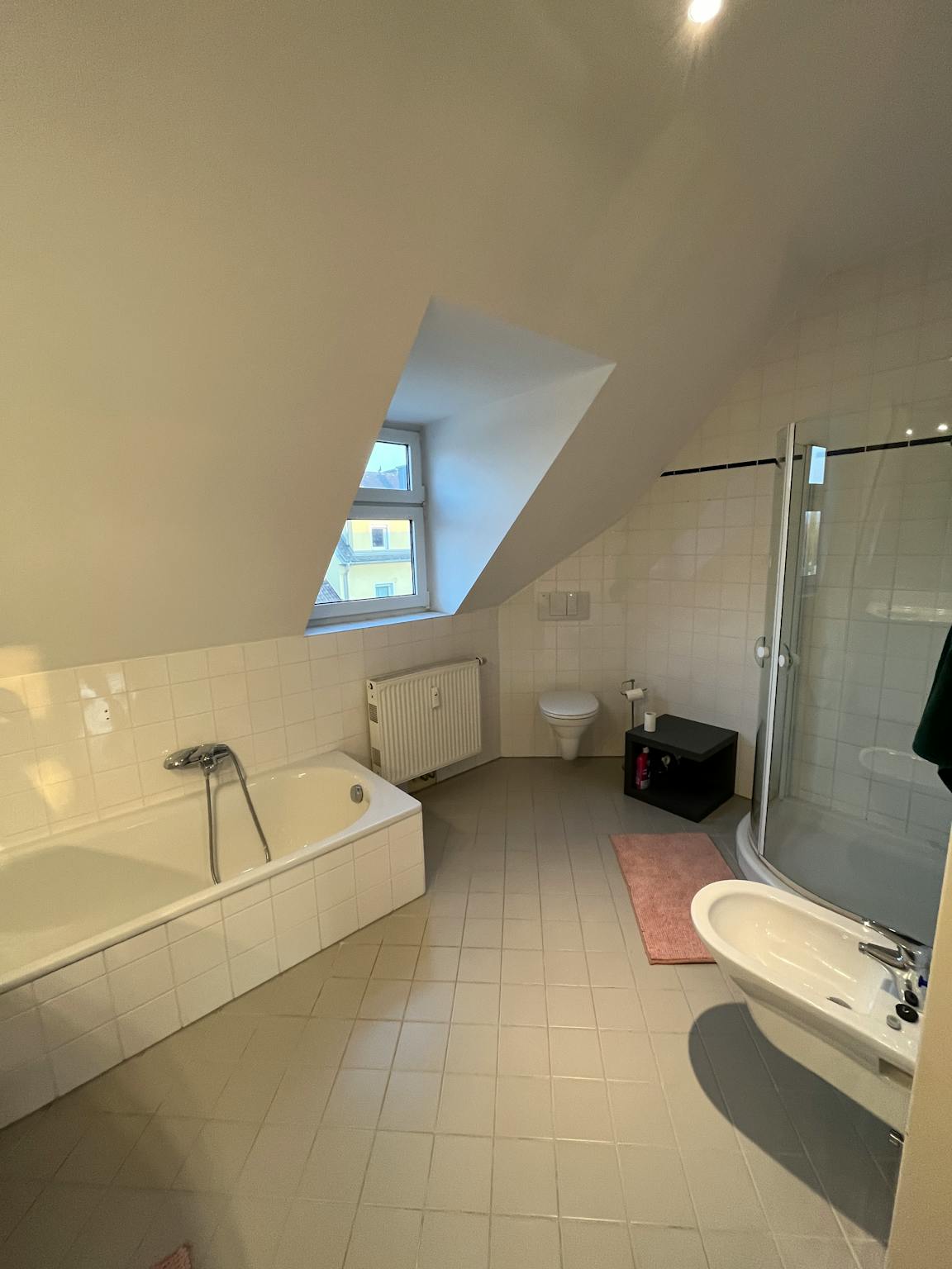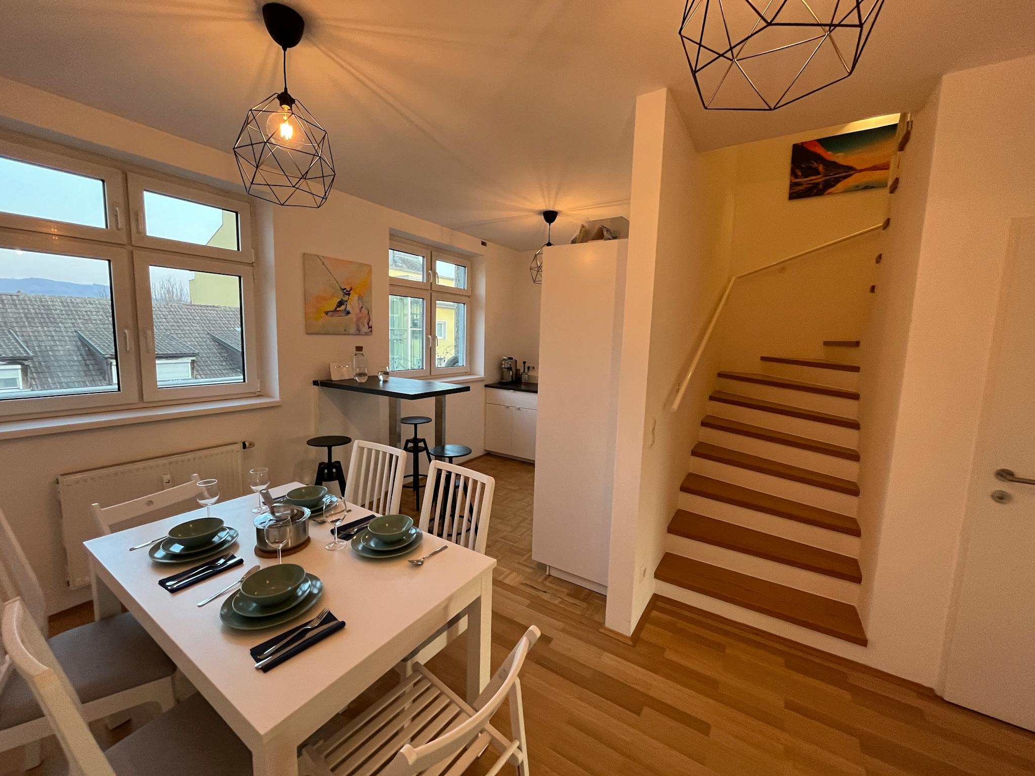The quiet and bright attic apartment is split over two floors including a rooftop terrace which offers morning and evening sun. It is located very close to the river and has an amazing view at the Pöstlingberg. The loft-like layout offers a great way of living, with a cosy communal kitchen and a beautiful roof terrace overlooking the rooftops of uptown Linz. The apartment has been decorated in a modern style and with a full equipped new kitchen, a storage room with a washing machine and a modern bathroom with separate toilet.