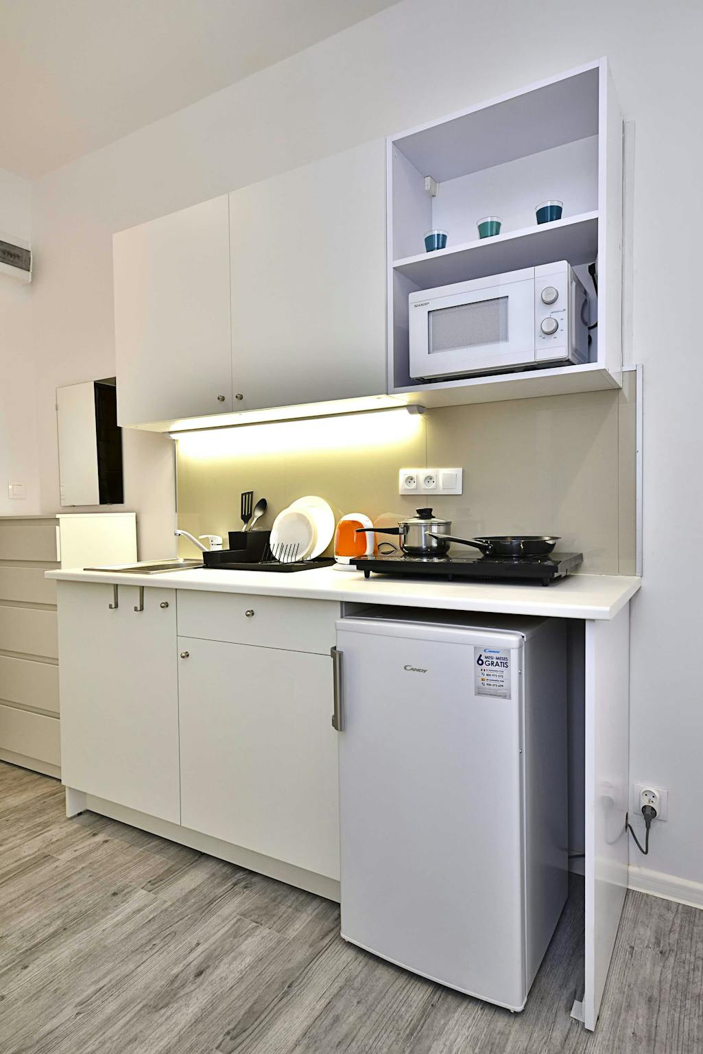 The apartment is fully furnished and equipped, prepared to specific standards to make you feel at home from day one. The inventory includes a double sofa bed, spacious wardrobe, chest of drawers, cabinets, shelves, table, chairs, standing and hanging lamps, washing machine, electric stove, microwave, fridge-freezer, electric kettle, vacuum cleaner, ironing board, clothes dryer, mop, iron, pots, cutlery, glasses, wine glasses, jugs, bowls, plates, pans, and other essential kitchen accessories.