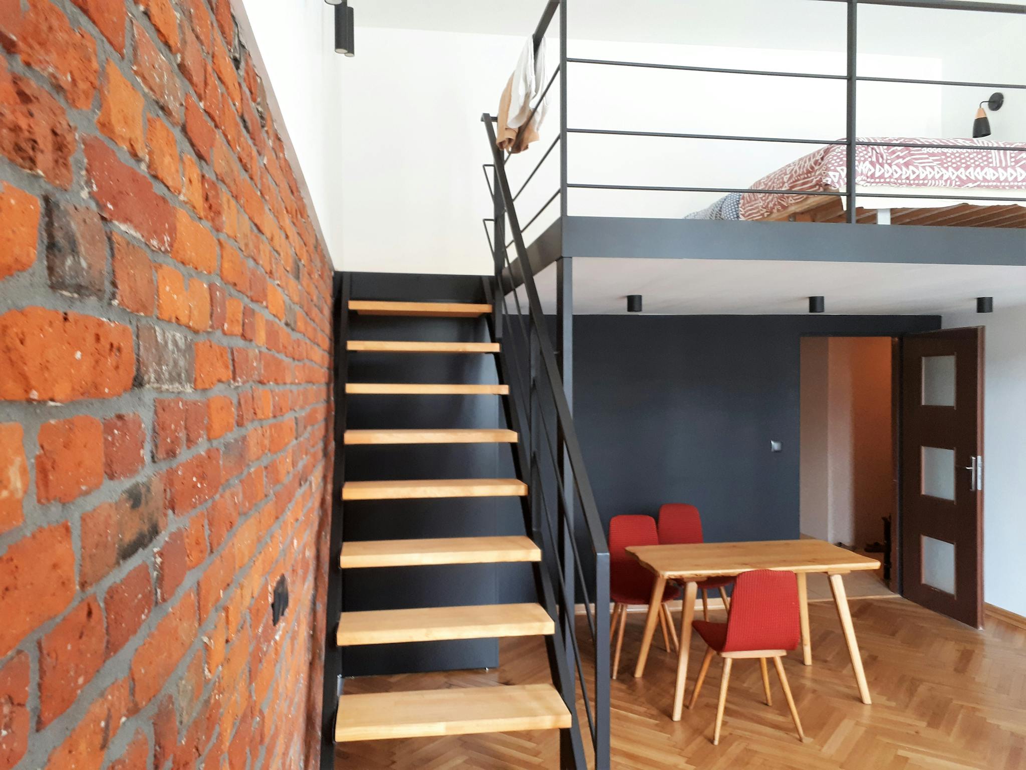 Welcome to our apartment in the heart of the city. The apartment is composed of two rooms, a bathroom with a walk-in shower, a fully equipped kichen, and an entrance hall. The larger room is a living room with a mezzanine that serves as a bedroom (a king-size bed that can be split into two single ones). The smaller room contains two sofas which comfortably sleeps 2 guests each. Additionally, we can provide a light folding bed, so the apartment can accommodate up to 7 guests