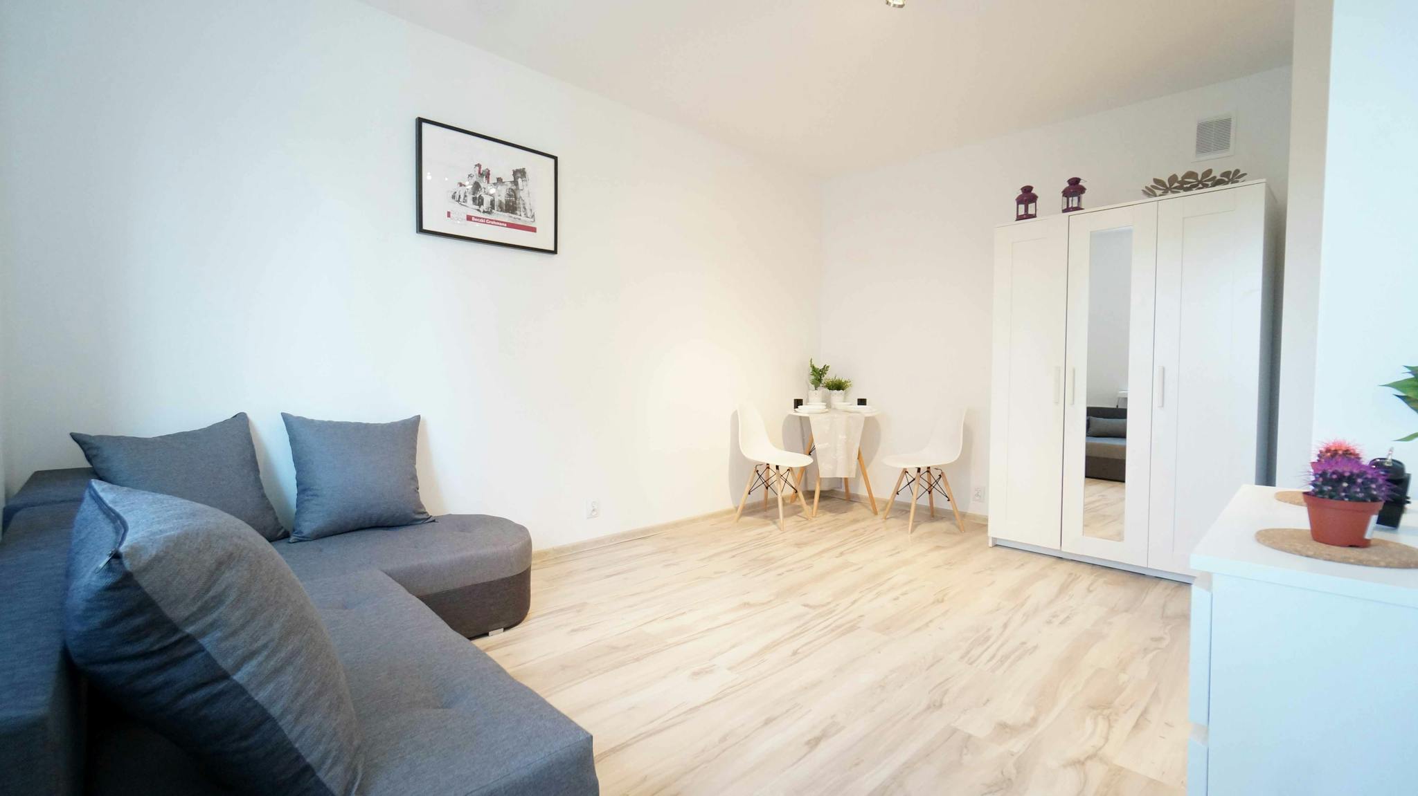 Fully equipped studios are bright and spacious, meeting specific standards to make you feel at home from day one. The studio includes a double sofa bed, a spacious wardrobe, a chest of drawers, cabinets, shelves, hangers, a table, chairs, standing and hanging lamps, a washing machine, electric stove, microwave, fridge-freezer, electric kettle, vacuum cleaner, ironing board, clothes dryer, mop, iron, pots, cutlery, glasses, cups, pitchers, bowls, plates, pans, and other essential kitchen accessories.