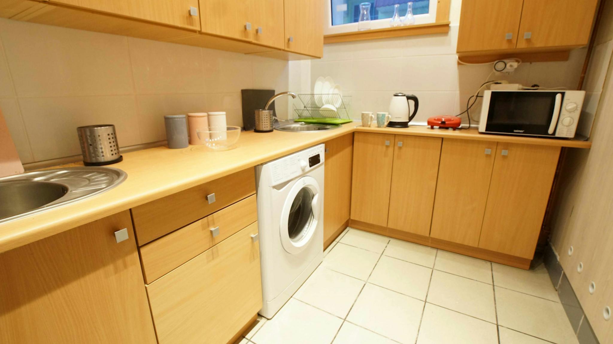 In the kitchen, residents benefit from modern appliances, including a fridge-freezer, electric hob, microwave, and cordless electric kettle. The kitchen is fully equipped with plates, cutlery, glasses, mugs, a complete set of pots and pans, chopping boards, colander, salt and pepper shaker, ladles, and more.