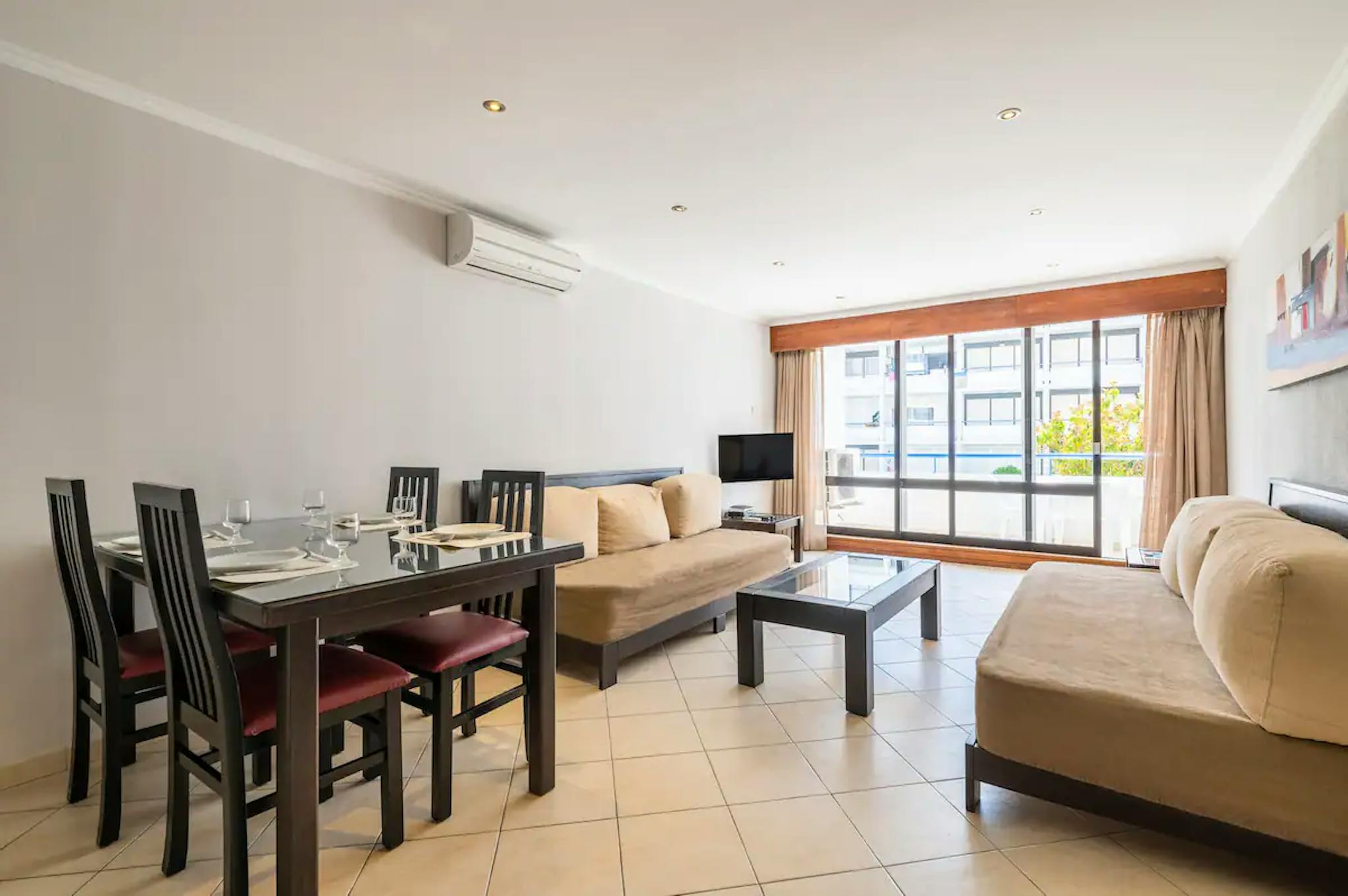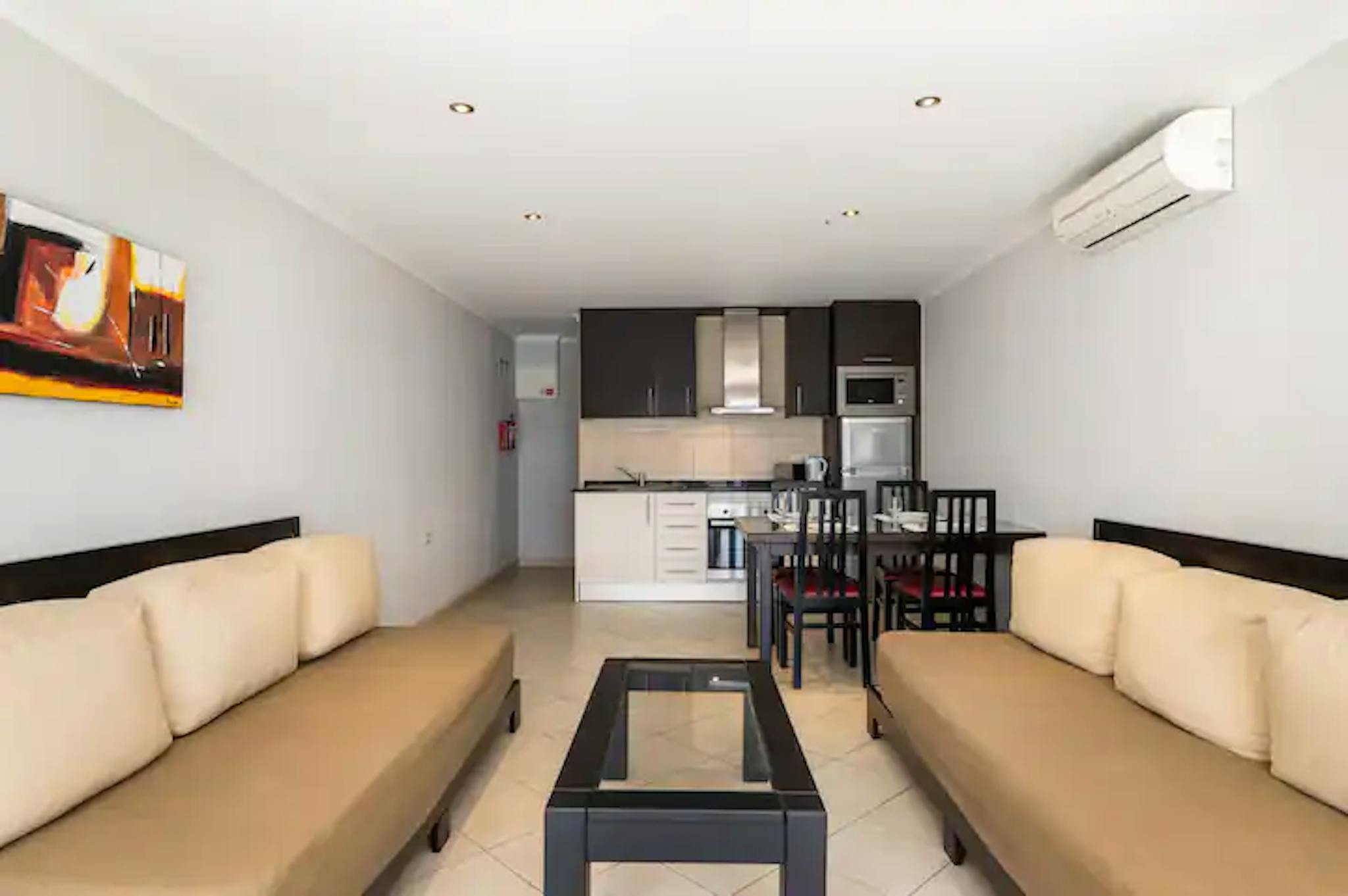The living room features two sofa beds that can accommodate two additional guests, flat screen TV, air conditioning, and a dining table. The living room has ample natural light and access to a private balcony.