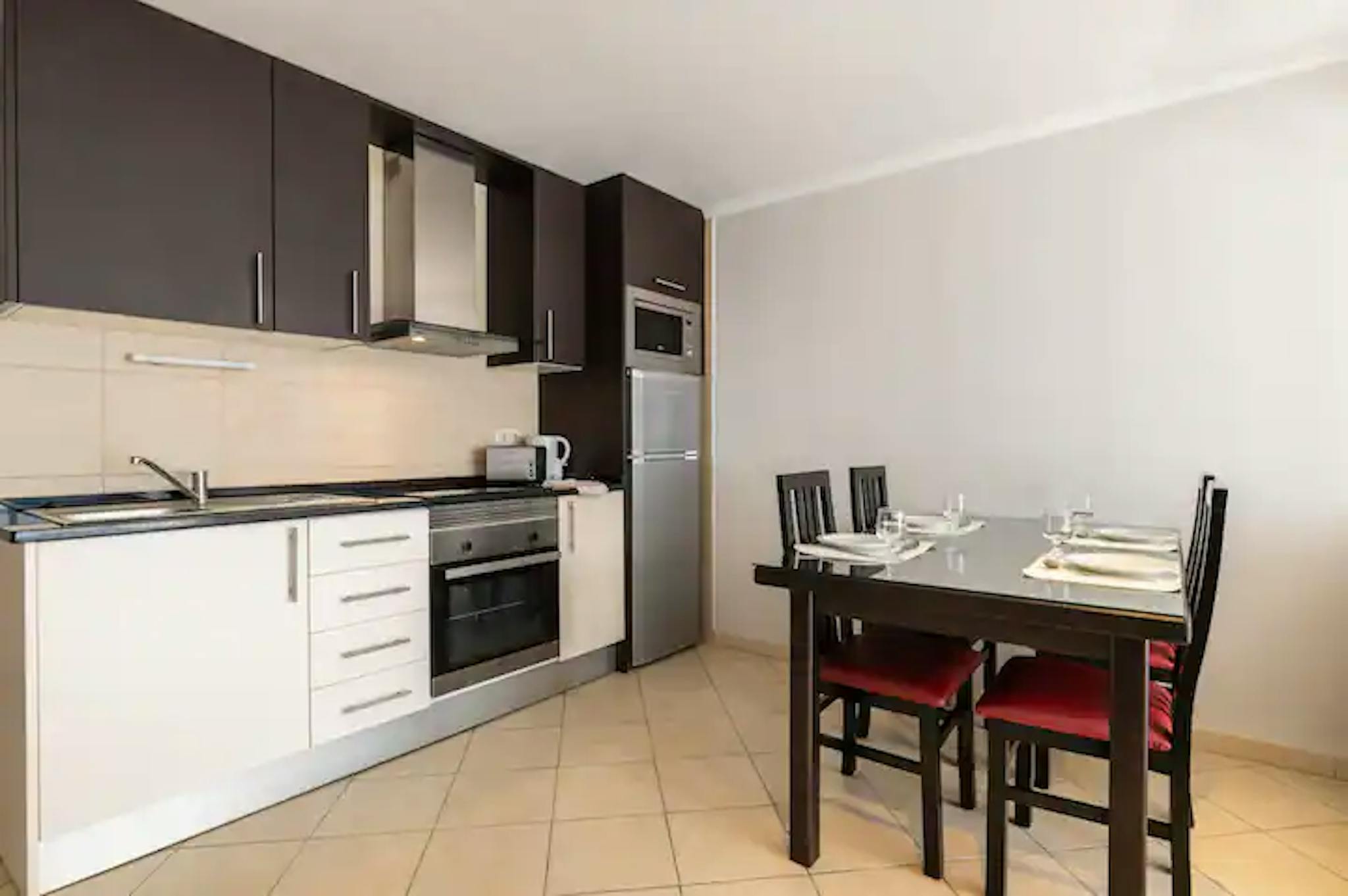 The kitchen is fully equipped with a stove, oven, refrigerator, microwave, toaster and kettle.