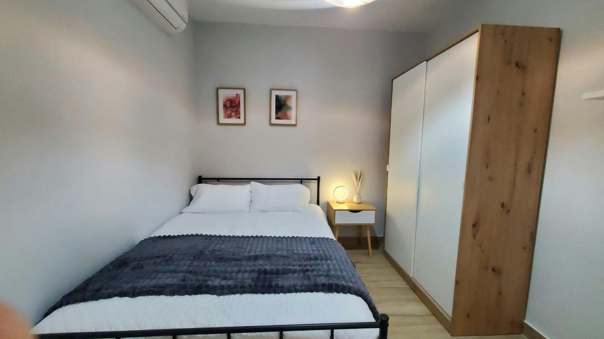 DORMITORIO 1: acogedora estancia con cama doble bastante cómodo y fantástica iluminación, suave ropa de cama, mega armario amplio, en ambiente luminoso y de calma perfecto para el descanso después de un día ajetreado en Madrid.