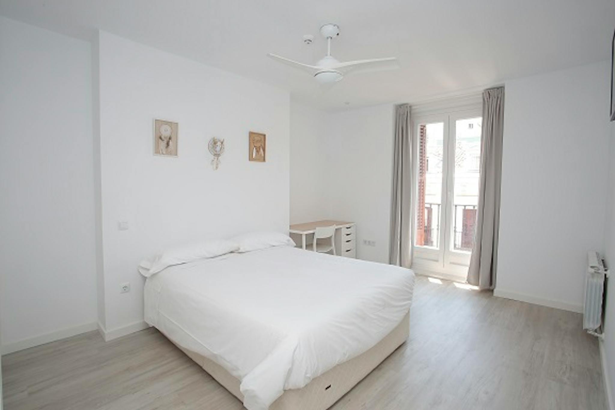 The room come with double bed, desk, chair and closet..