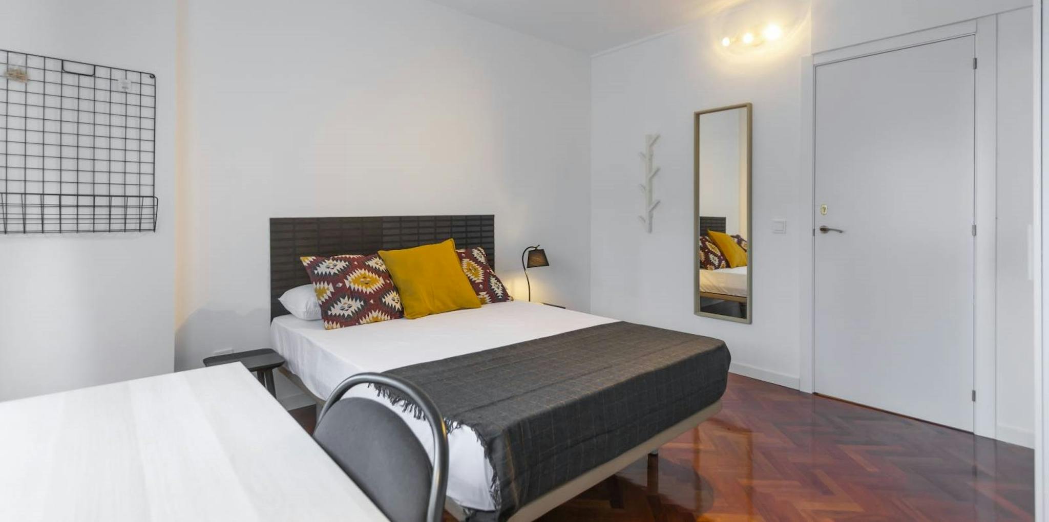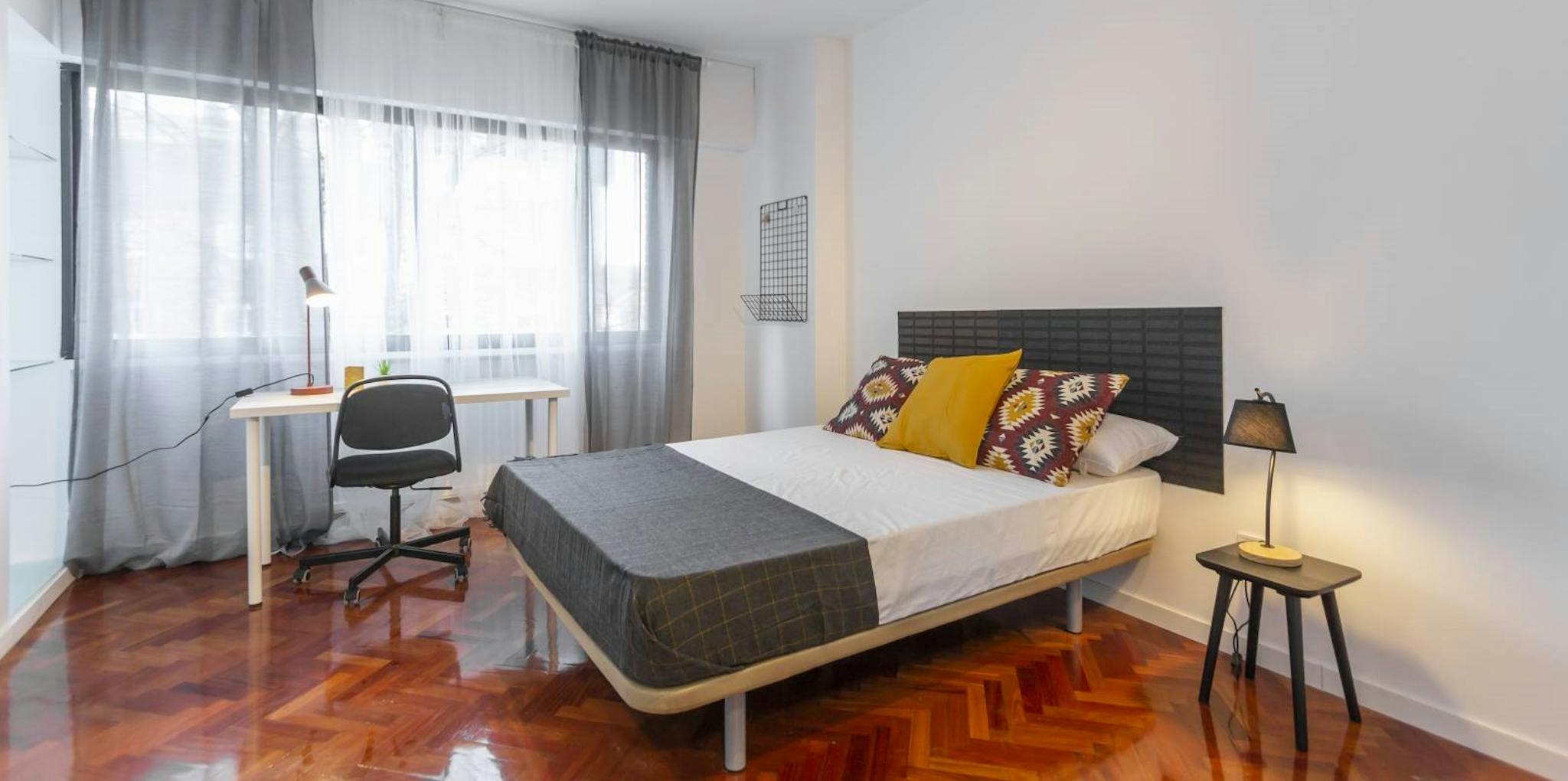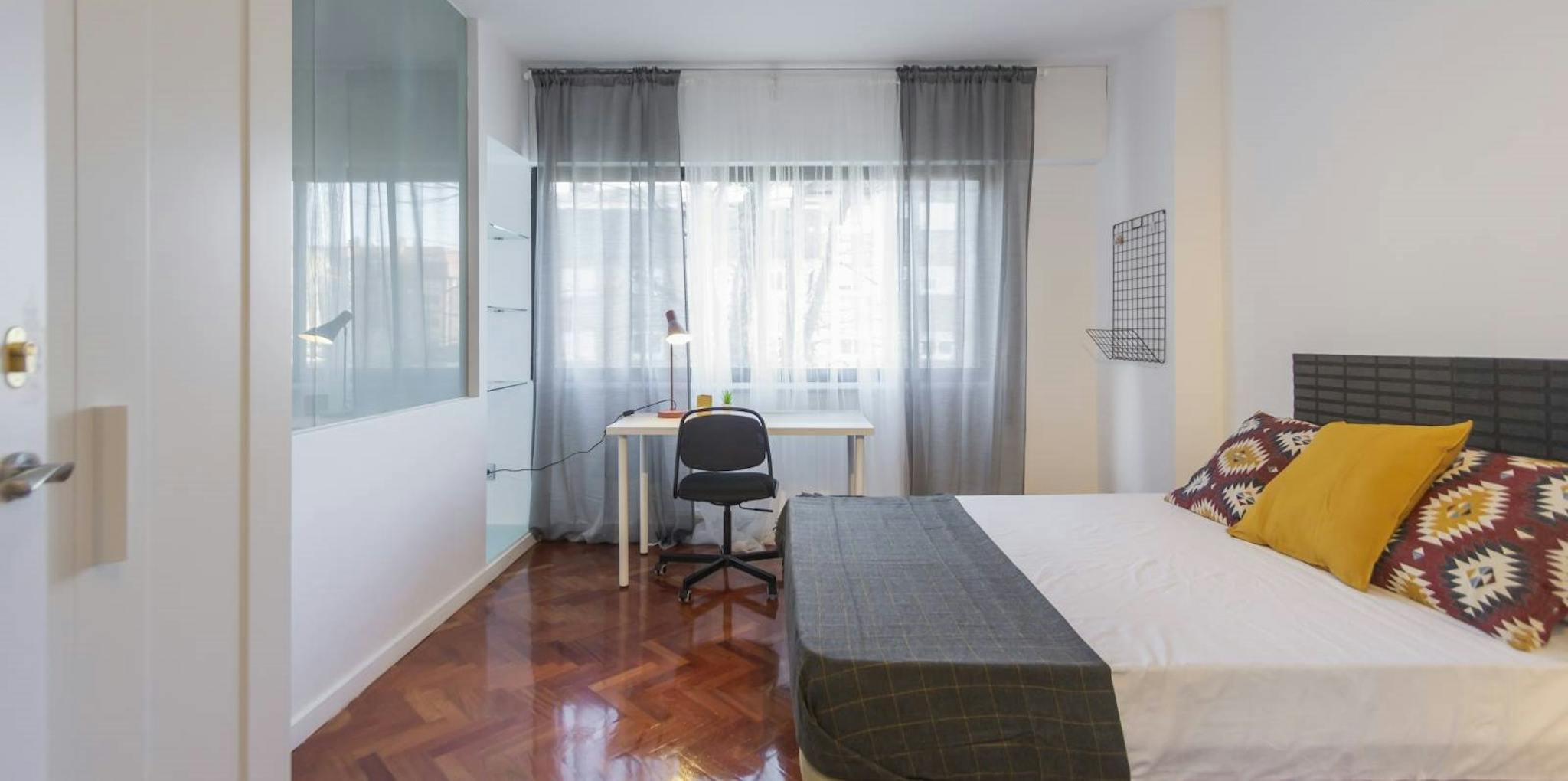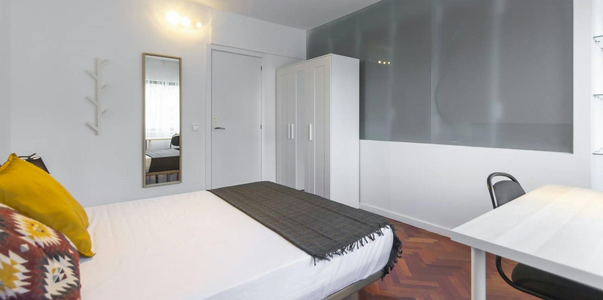 La habitación cuenta con cama matrimonio, zona de escritorio y armario. El apartamento cuenta con cocina completamente equipada, 2 baños y 1 aseo compartidos por un máximo de 8 personas.