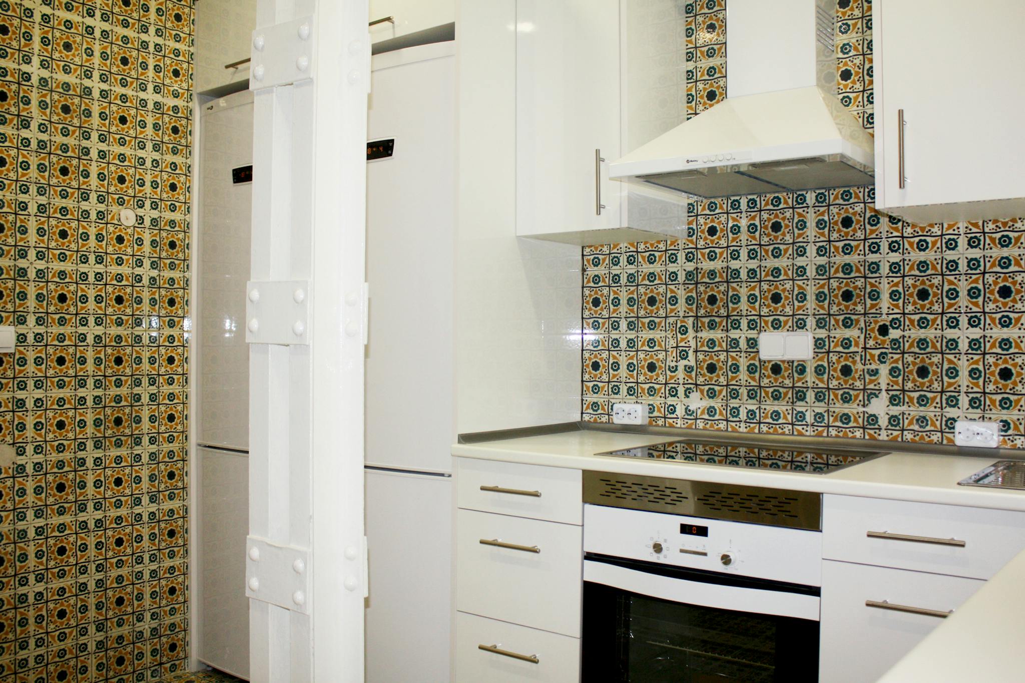 Spacious outside room with a big window type balcony overlooking to a quiet street parallel to Gran Vía. We kept the original windows of the old building in the reform, creating a unique space that combines ancient and modern elements. The distribution of the furniture has been designed to maximise the space standing out comfort and practicality.