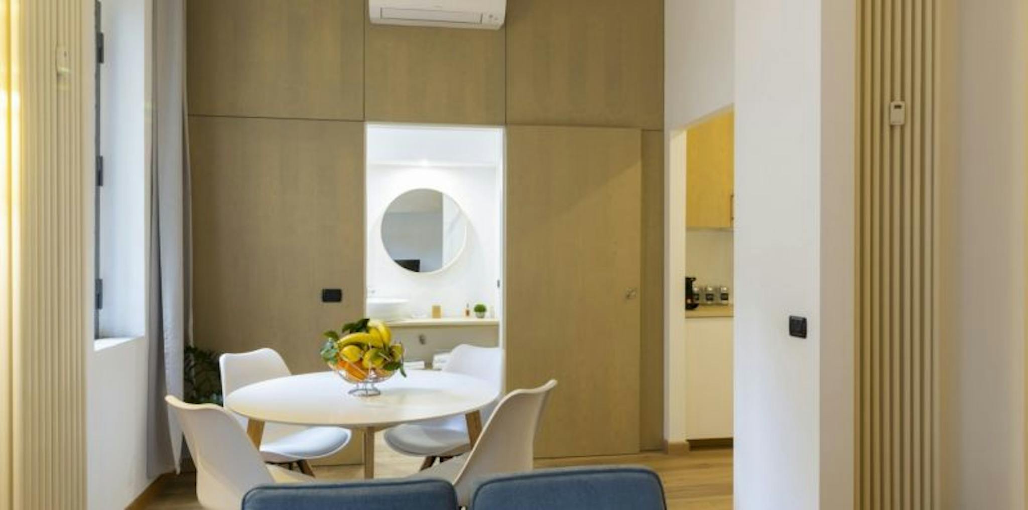 The apartment is air-conditioned and has many amenities for pleasantly accommodating up to two adults. The kitchen is equipped with an induction stove, refrigerator, microwave, dishwasher, toaster, kettle, dishes, pots and pans. The living area consists of a large table, usable both for eating meals and as a workplace, a small sofa, and a 55 ”smart TV connected to the Internet so that you can always follow your favorite TV series by connecting to streaming platforms (Netflix, Amazon Prime Video). A beautiful double bed and a very large wardrobe complete the sleeping area.