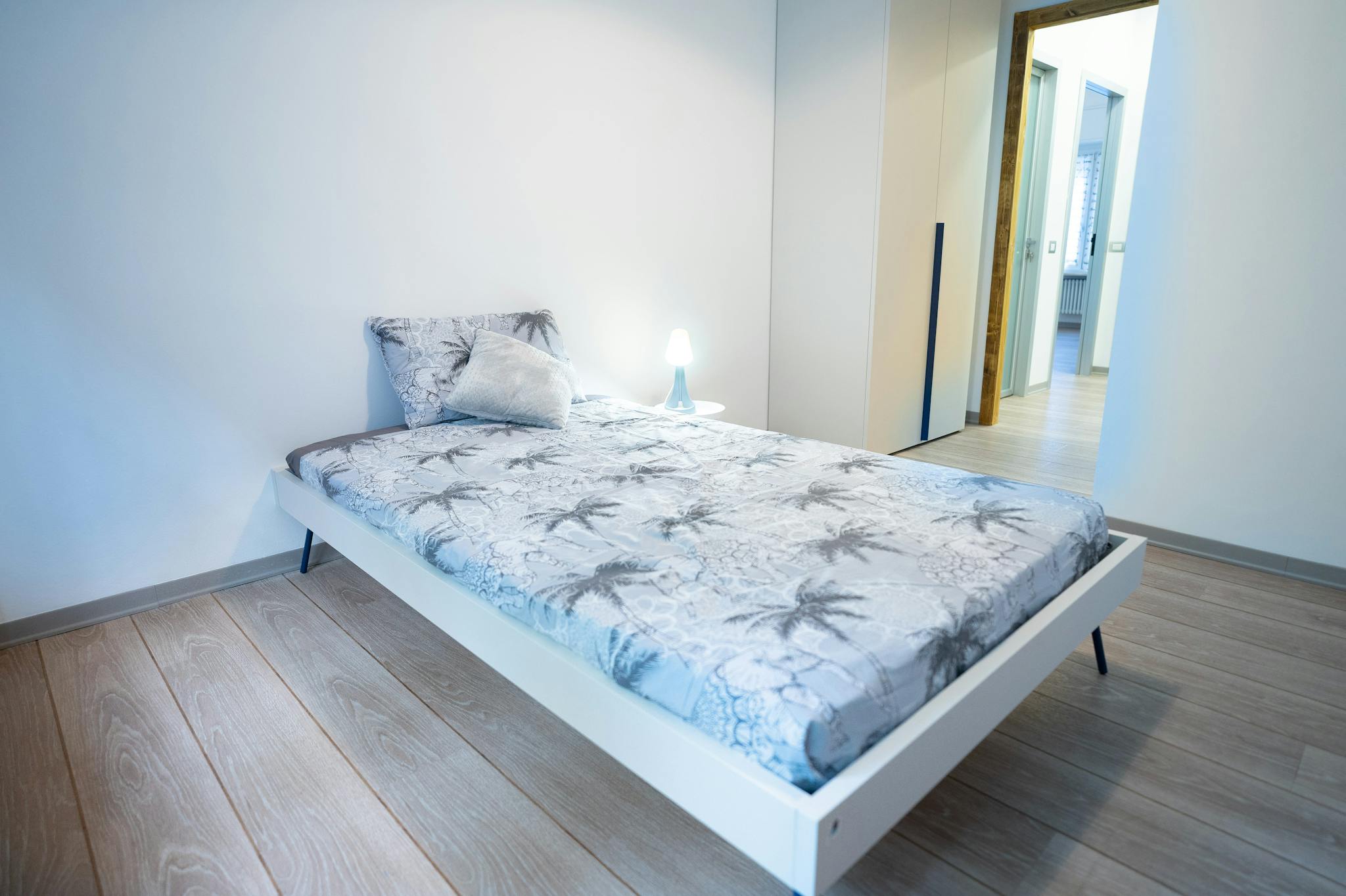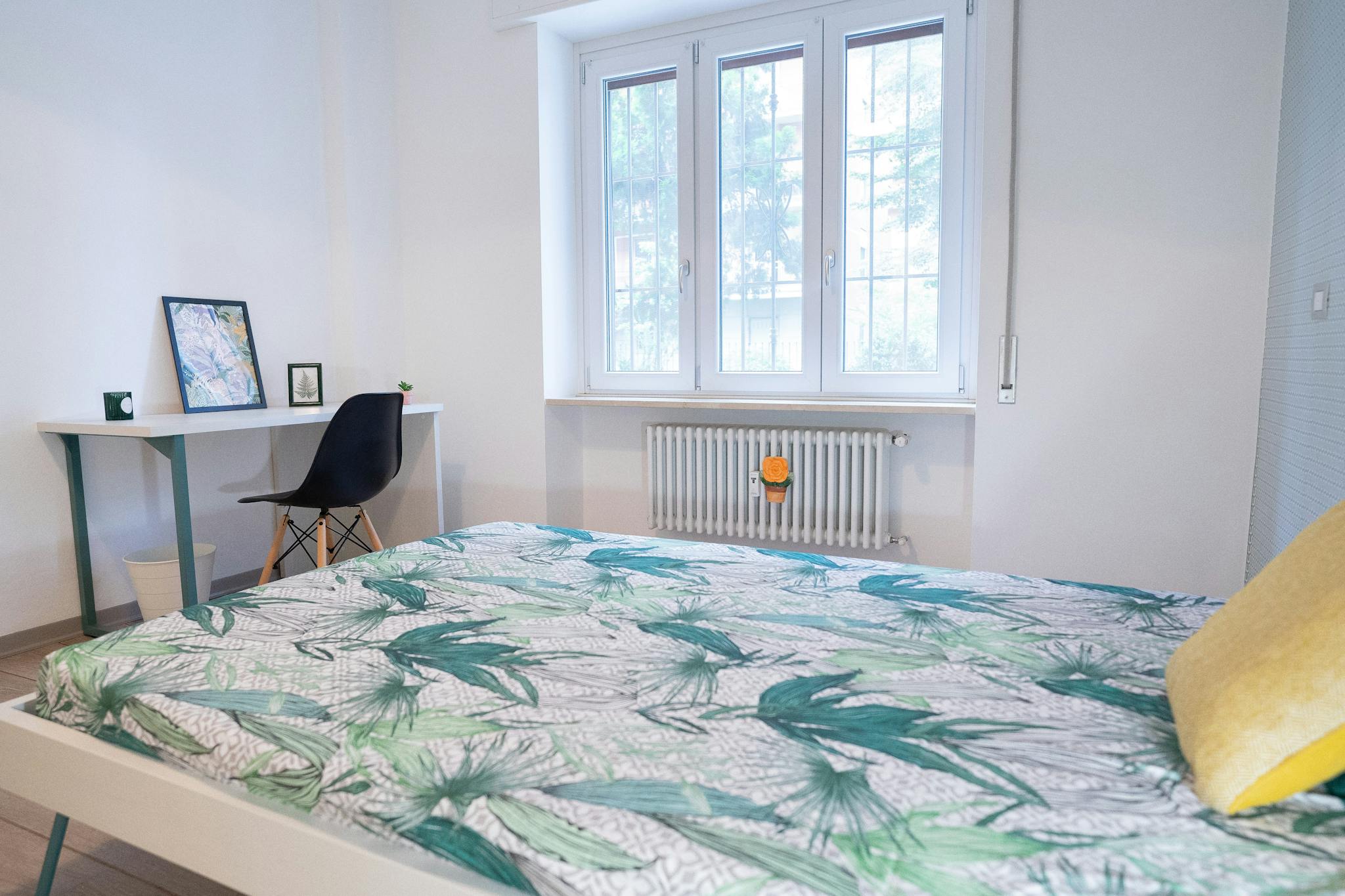 The room is very quiet, it features a wardrobe with drawers, a full-size bed (120x200cm) night table and a desk with drawers and a chair.