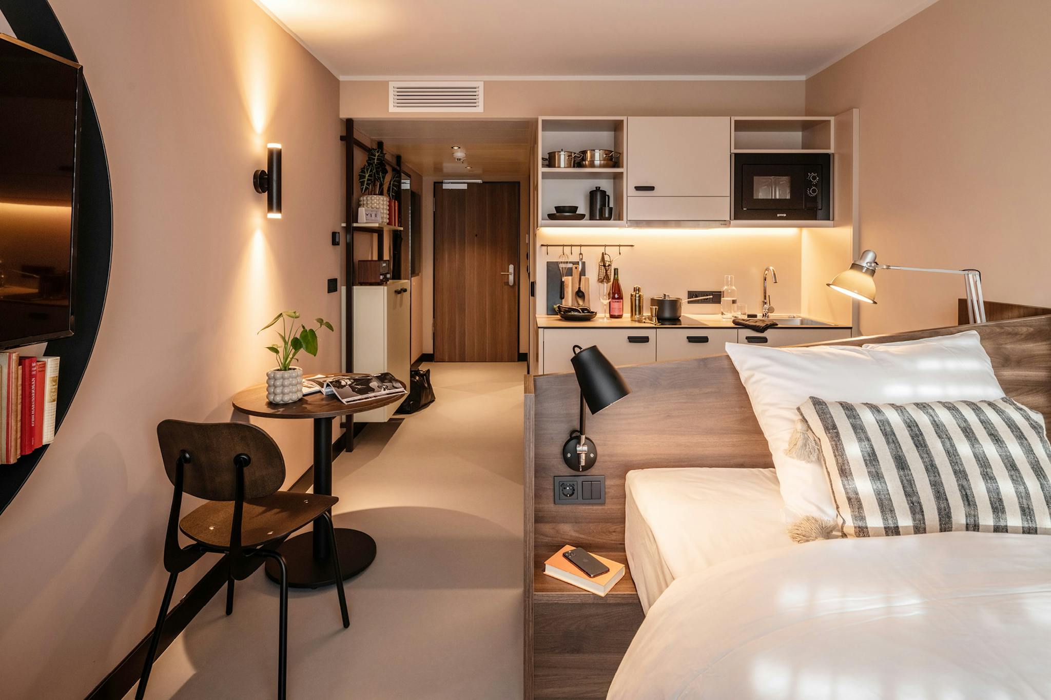 There is a possibility to choose between different-sized mattresses (140x200 cm or 160x200 cm). Furthermore, the flat features high-speed WiFi, a wardrobe, a safe, radio, a hair dryer, towels & linen, and a coffee table with an armchair.
