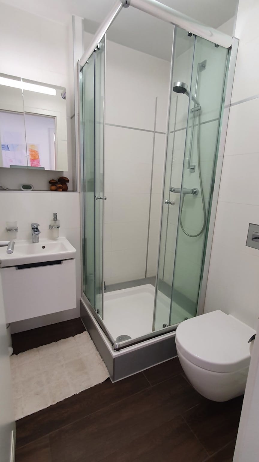 The bathroom is also equipped with high quality brand furniture (Villeroy & Boch). You can enjoy a relaxing bath in the large bathtub. The bathroom is equipped with a washing machine. The apartment includes a guest bathroom with shower and toilet for use in hectic mornings. In both bathrooms, a towel radiator provides warm towels.