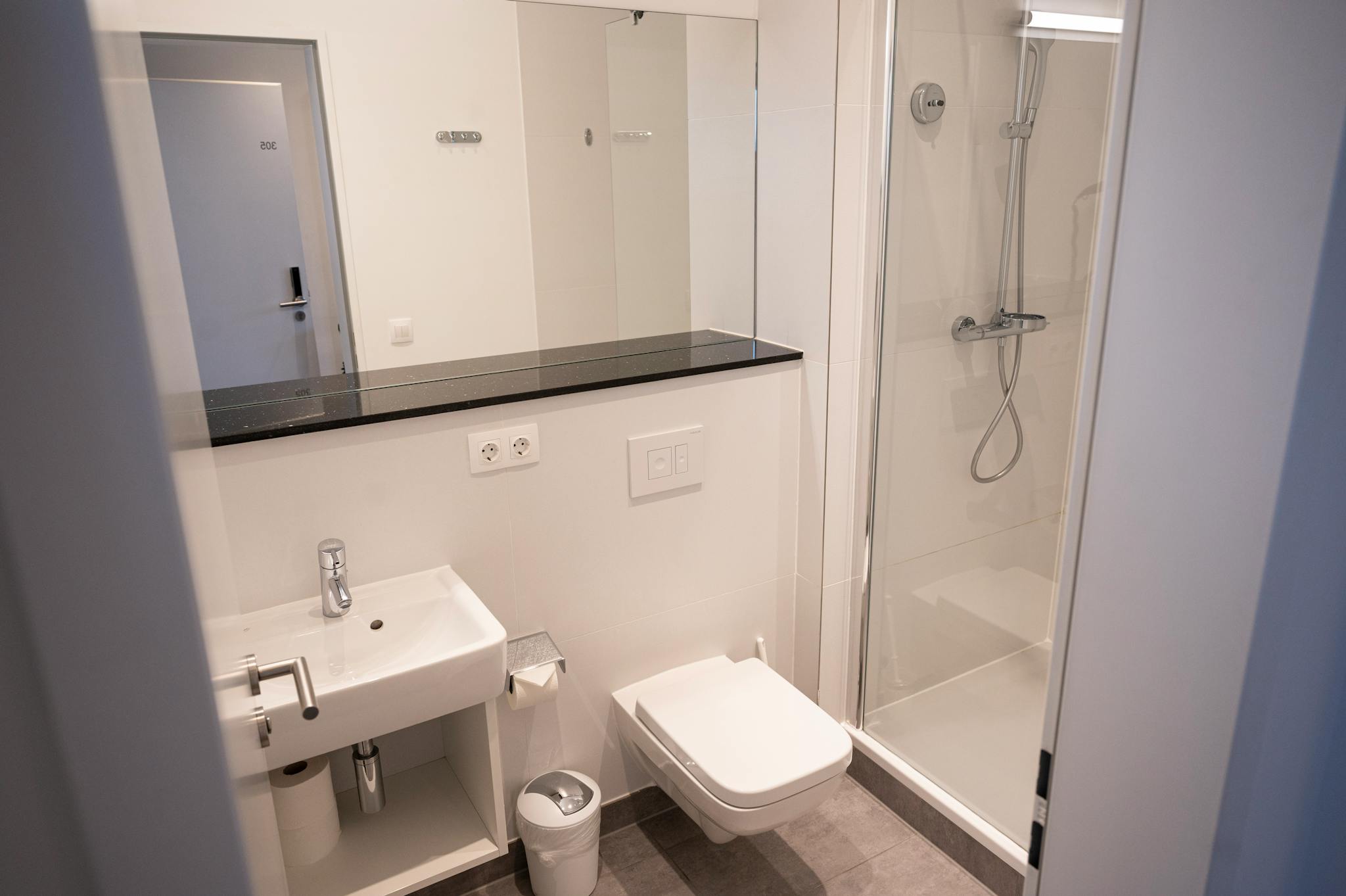 - Bathroom with WC, rain shower and shower set, clothesline, large wall mirror, towel radiator and hairdryer,