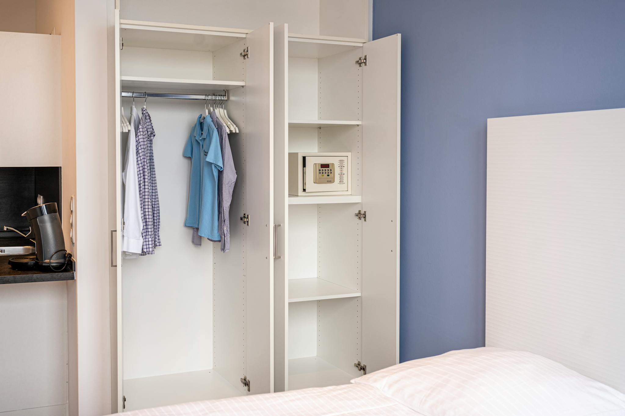 - Spacious built-in cupboard with suitcase shelf and integrated safe,