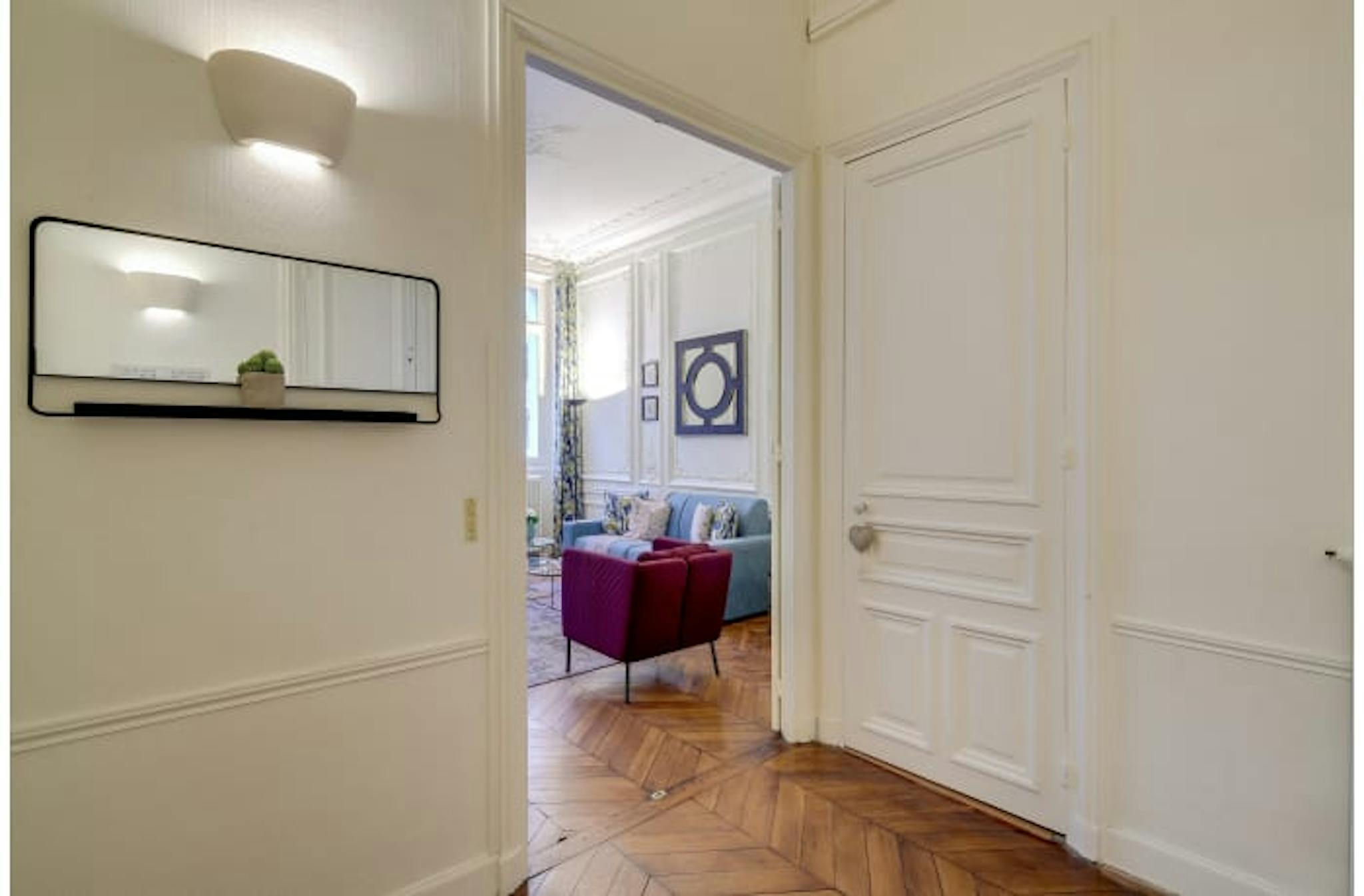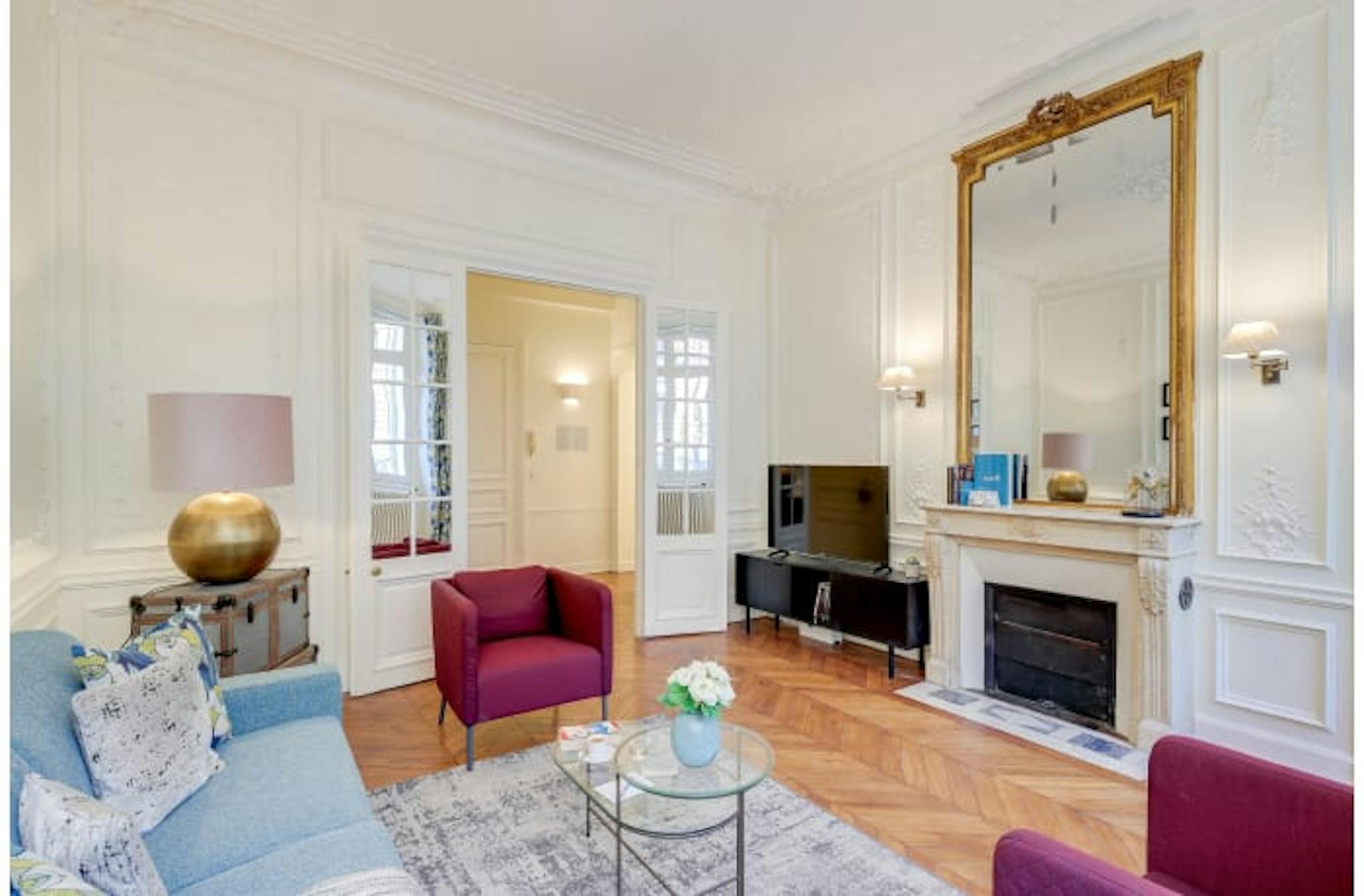 The spacious 2 bedroom Messine vacation apartment in Paris’s upscale Champs-Elysées neighborhood will make you feel right at home. Situated in a beautiful Haussmann building in the most central shopping district of the city of lights, the ‘Triangle D’Or,’ it’s a perfect location for fashionistas and culture lovers. Aside from the world’s top brands in fashion, you’ll also find many of the city’s most iconic attractions within a short walk, including the Arc de Triomphe (10 min), the Boulevard de Champs-Elysées (7 min), the Grand Palais and the Louvre (10 min). The Miromesnil Metro and The Saint Lazare Train Station are just down the street (2 min) and buses run around the corner (2 min).
