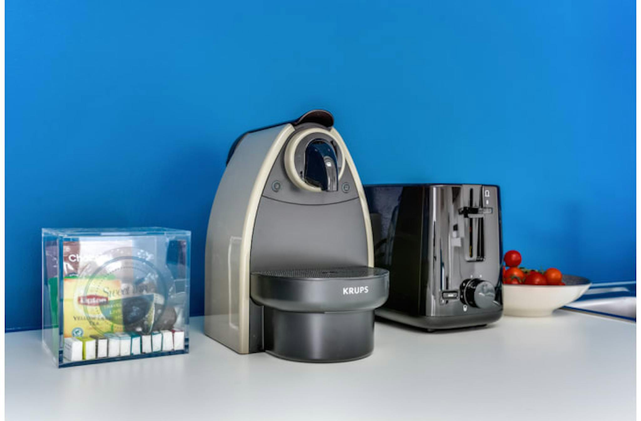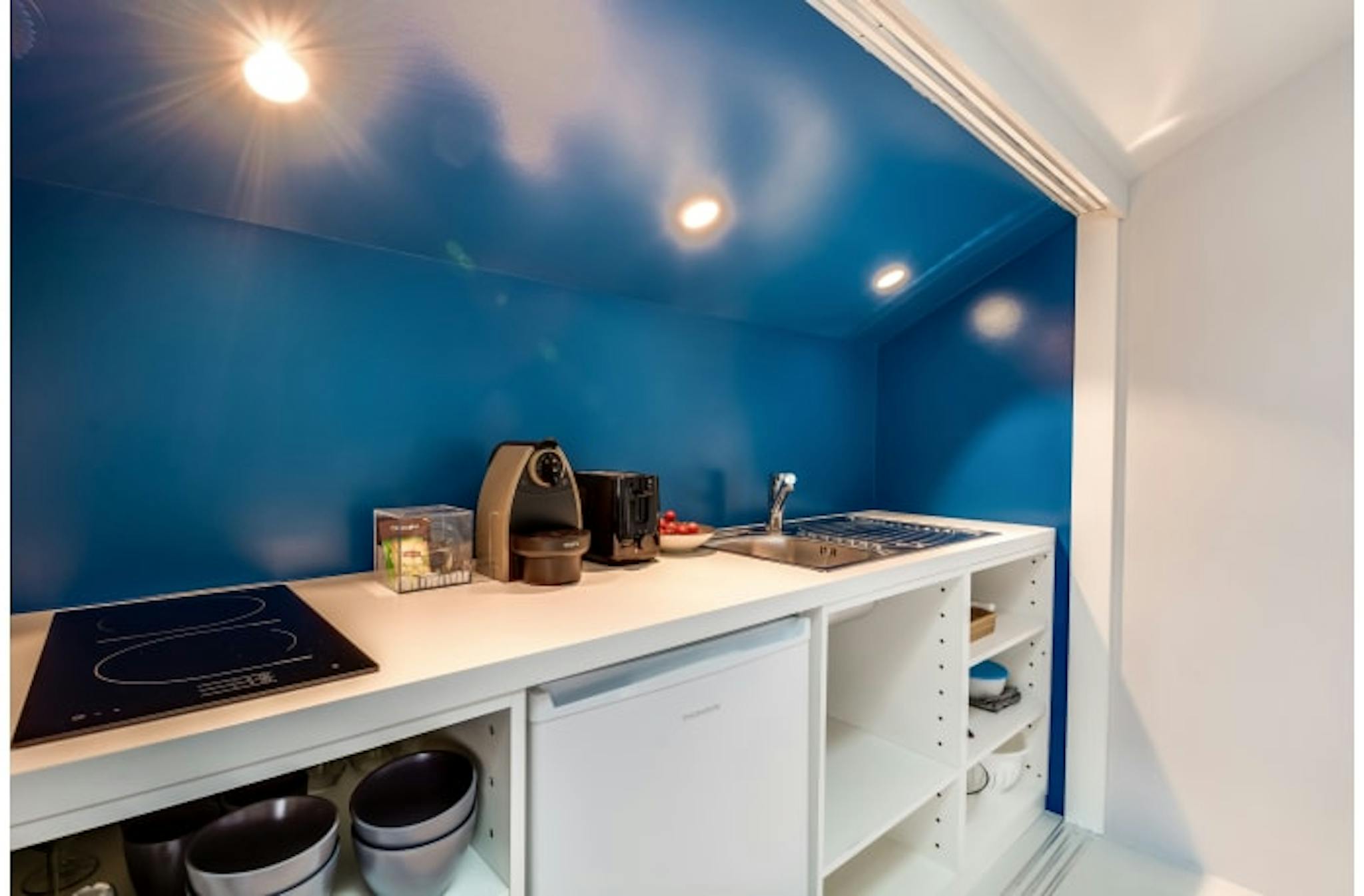 In cool shades of blue and white, our local interior designer has created a space fit for a painting. Skylights fill the space with sunshine, and twinkling fairy lights add a touch of magic. The fully equipped kitchen has everything you need for gourmet dining at home. Premium amenities include free WiFi, cable TV, hotel beds and linens, luxury toiletries, and a Nespresso machine.